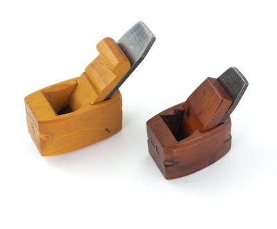 B62-378. MODERN MAKER. Lot of Two Miniature Bill Carter Instrument Planes. Both boxwood, one with 1-1/8" tapered sole and 1/2" cutter, marked "Carter London" on toe; the other oxidized to a deeper color, 7/8" compassed sole and 3/8" cutter, marked "BC" on toe and "1" on heel, both cutters marked "BC." From the collection of Cliff Sapienza. Fine 300-600