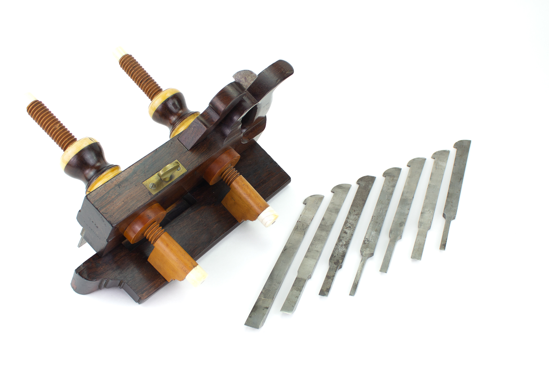 B62-639. SPLIT IVORY NUT PLOW PLANE. Greenfield Tool Co. No. 536/8. Rosewood body, boxwood arms and inner nuts, sandwich boxwood and ivory outer nuts, ivory tips. Ivory on the nuts is lightly yellowed with a couple of cracks, the ivory tips are whiter with some small checks. Wood is overall near fine noting a small chip from the tip of the fence and a couple of dings. Complete set of eight Greenfield cutters. From the collection of Steve Dice. Fine 3000-6000