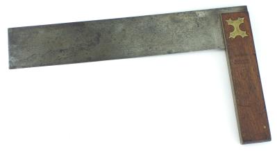B62-719. FRAMING SQUARE. P. B. Fraley. 15" wide unruled blade, 9-1/2" mahogany handle with brass edge and quatrefoil escutcheon. Marked "P.B. Fraley Warranted", faint but legible. Fraley (or Frayley) was an early Philadelphia sawmaker who, like so many others, also made squares and got swallowed up in the 1850s by the Disston juggernaut. From the collection of Carl Bopp. Good+ 120-240