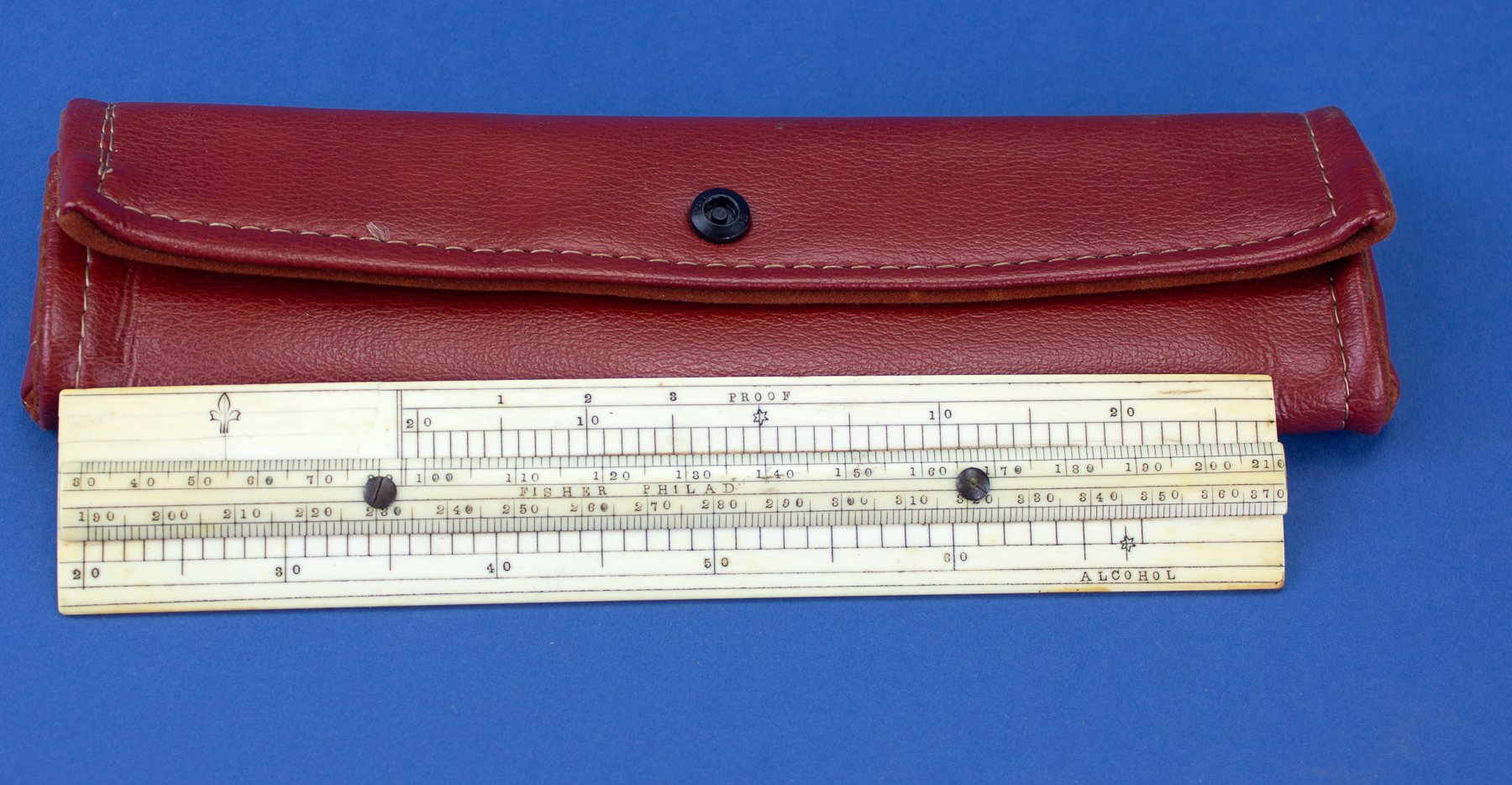 B62-720. IVORY HYDROMETER RULE. Fisher. Slide rule used in conjunction with a hydrometer to determine the proof, or alcoholic content, of beverages. This is the pattern invented by John Dicas in 1780 which would become the standard US method. See Rees, pp. 234-236. Marked "Fisher Phila", presumably Martin Fisher who worked in the early 1800s. Ivory is only very slightly yellowed, with a repaired crack at one end. In a fitted leather pouch that is too supple to be 200 years old and has a modern snap fastener. Fine 200-400