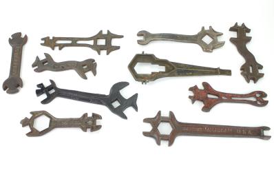 B62-759. DEALER'S LOT OF FARM WRENCHES. Most are double ended and unmarked, a few are marked Greenlee, Moline Drill, American Harrow Co., MTM Co., and one marked Peru. Some surface rust on a few. A couple have traces of red paint, one is made of beryllium. As is, no returns. Good 60-120