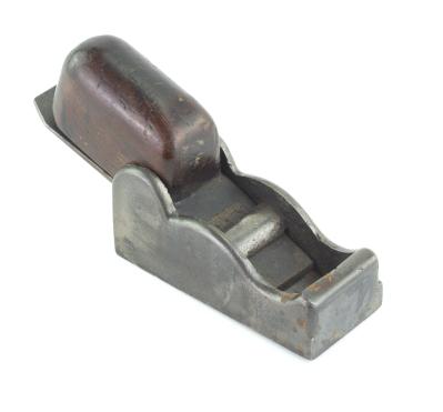 B63-356. BULLNOSE CHARIOT PLANE. Unsigned and craftsman made. Cast steel body with 3-7/8" sole, red beech wedge with integral steel bridge, 1-1/4" John Bull iron. Chip to right cheek at heel, wood has a few scrapes but near fine. From the collection of Pat Gefre. Good+ 100-200