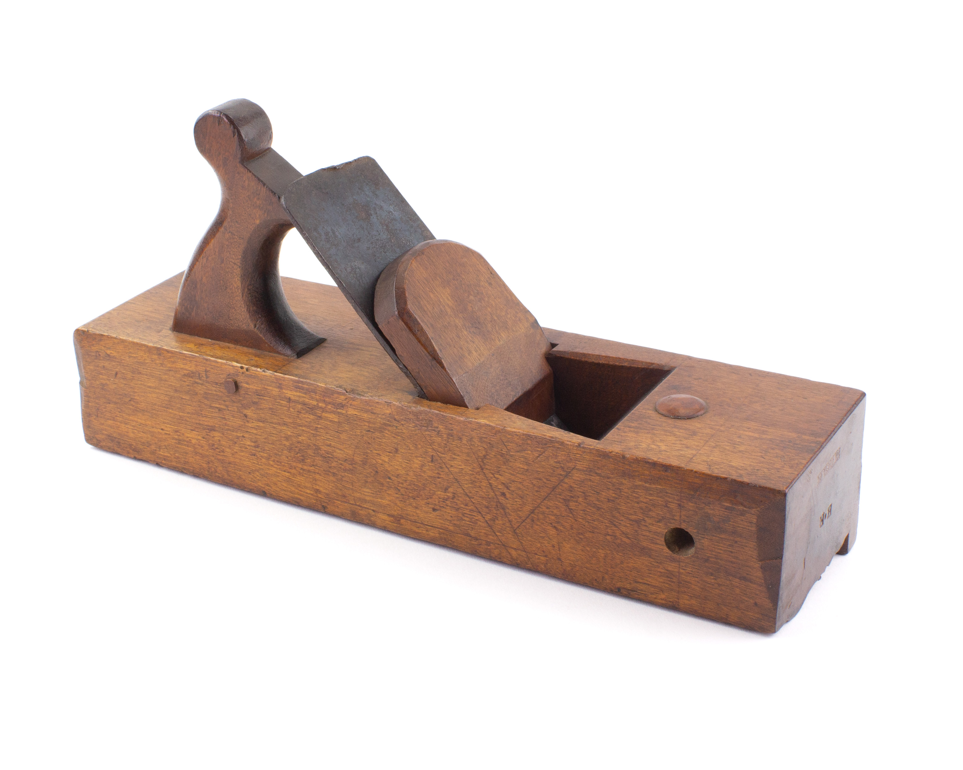 B63-440. CROWN MOLDER WITH MOUSE EAR TOTE. J. Fisher. 14" sole, integral fence, 2-3/4" unmarked cutter, spalled. Wide flat chamfers, pegged offset tote, apprentice hole. The tote has the very rare mouse ear shape, designed to make room for the cutter while still allowing for a full grip. The entire plane is in like new condition. Four star mark. From the collection of Steve Dice. Fine 600-1200