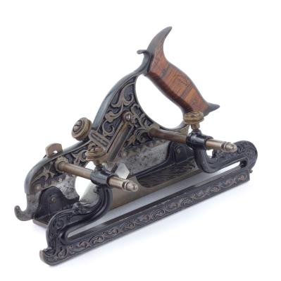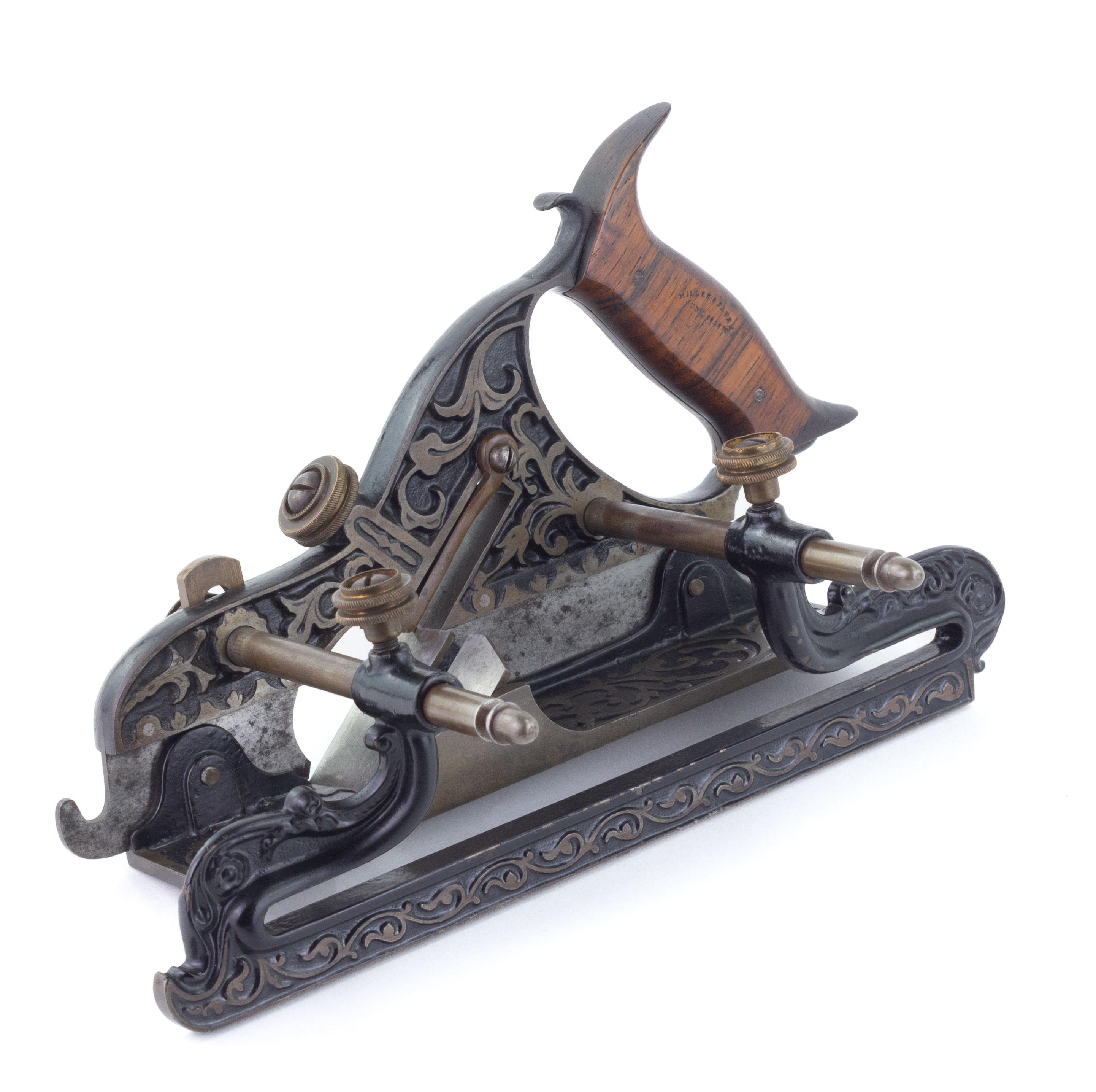 B63-537. MILLER'S PATENT. Type 1 Stanley No. 41. Proper hooked Type 1 with football mark on skate, two piece nuts and acorn finials on the arms. Complete japanning, tote fine. One of the nicest we've seen. Fine 2000-4000
