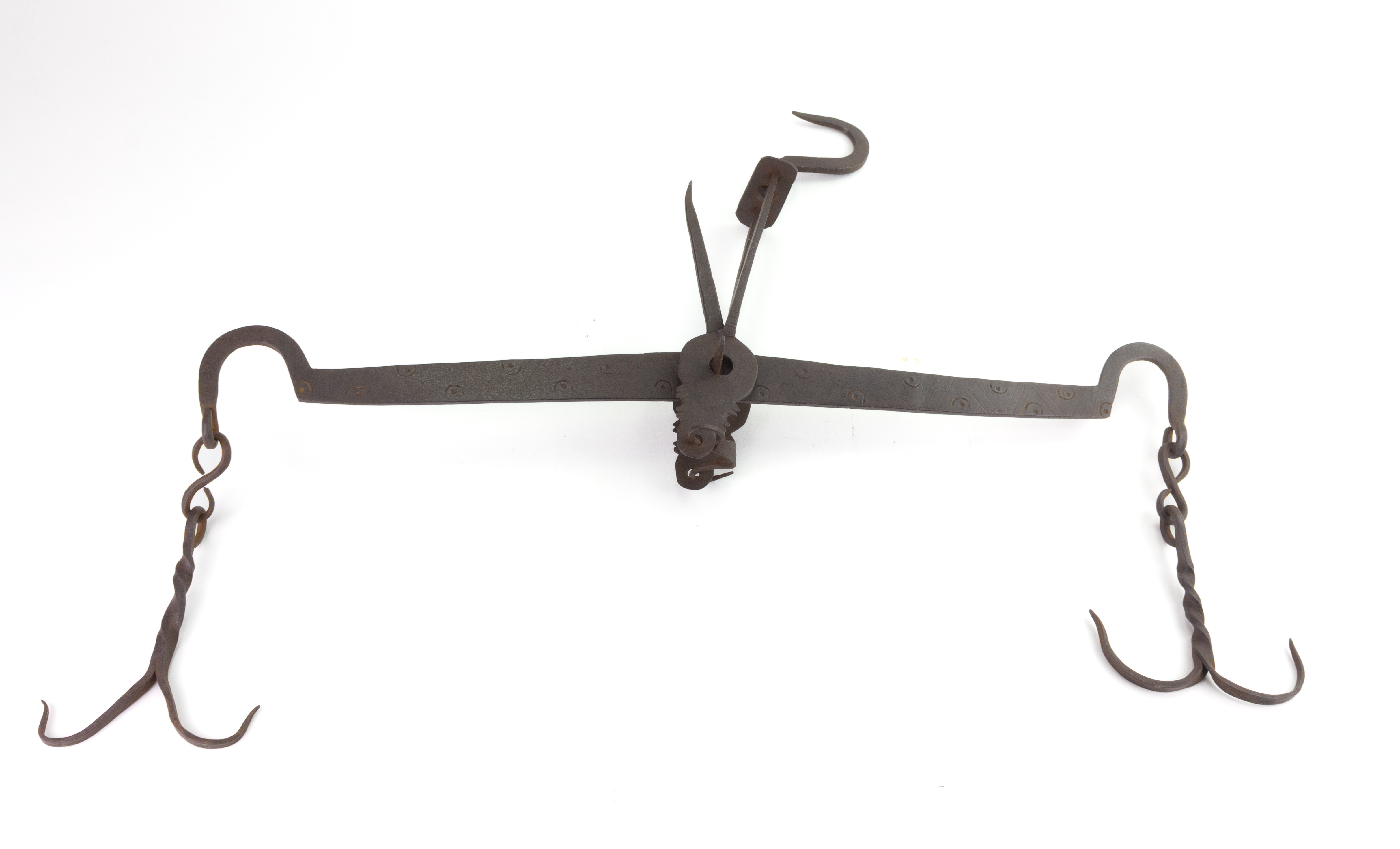 B63-699. STEELYARD SCALE. Smith made. The center support has a decorative scalloped pattern to the edge, there are a series of small decorative circles punched into the arms, and the hanging hooks on the end are twisted. 20" wide. Fine 120-240