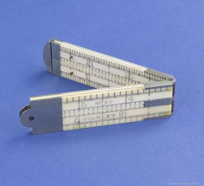 B64-74. IVORY CALIPER RULE. Stanley No. 39. Four-fold, one foot, ivory with German silver hinges and caliper, Type 2 mark. Very clean, mellowed to a light yellow, straight with crisp edges and all pins, very light wear to markings. Condition: Fine, Estimate: 200-400