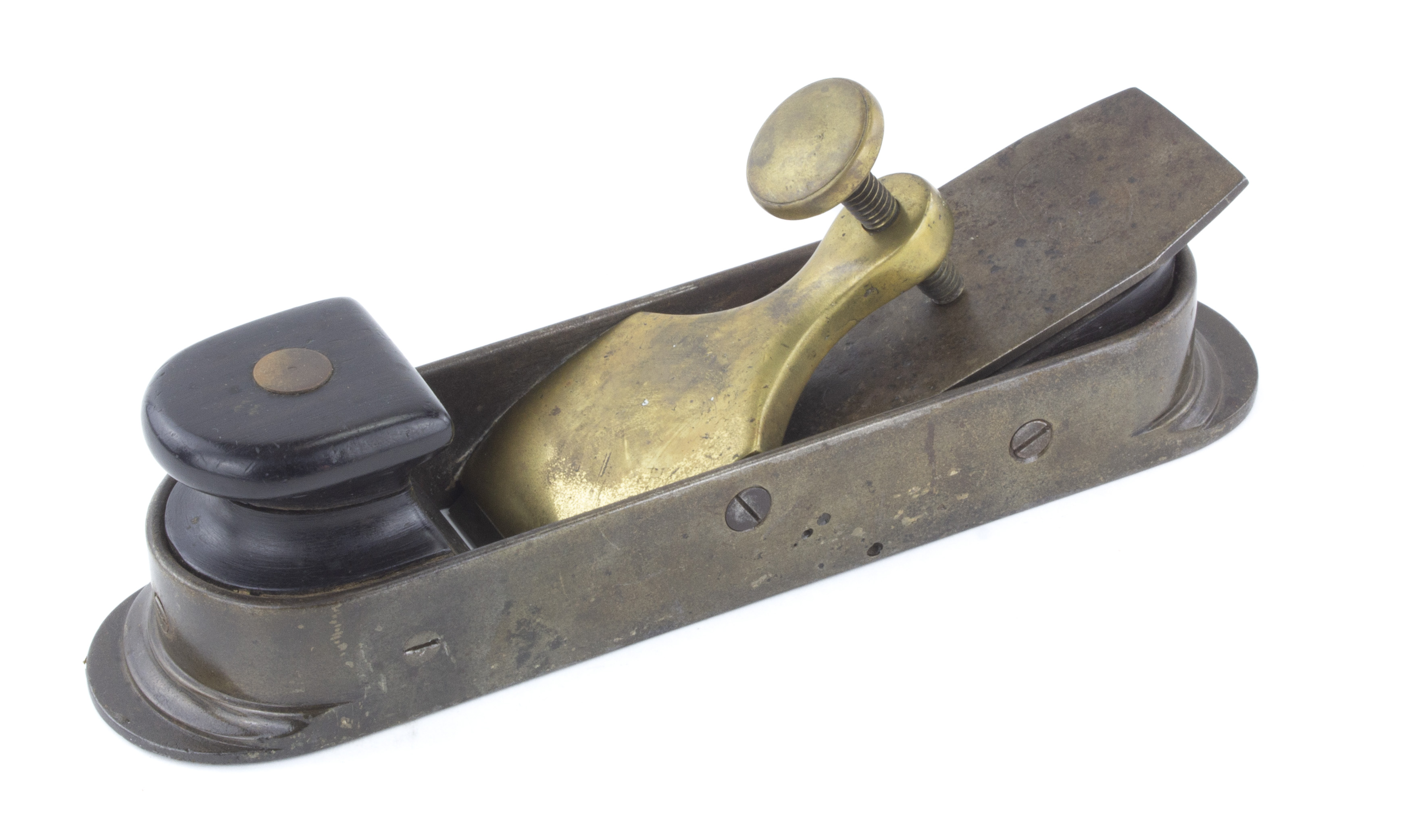 B66-137 INFILL MITRE PLANE. Looks user made, unmarked. Cast iron body with 10-1/2" sole, 2-1/8" Chillington Tool Co. iron. Low profile with decorative shape, dark rosewood bun and fill, bun has split that is repaired with boxwood button. Gunmetal lever cap with large locking screw. A few casting flaws in left cheek. Unusual and attractive design. Good 125-250
