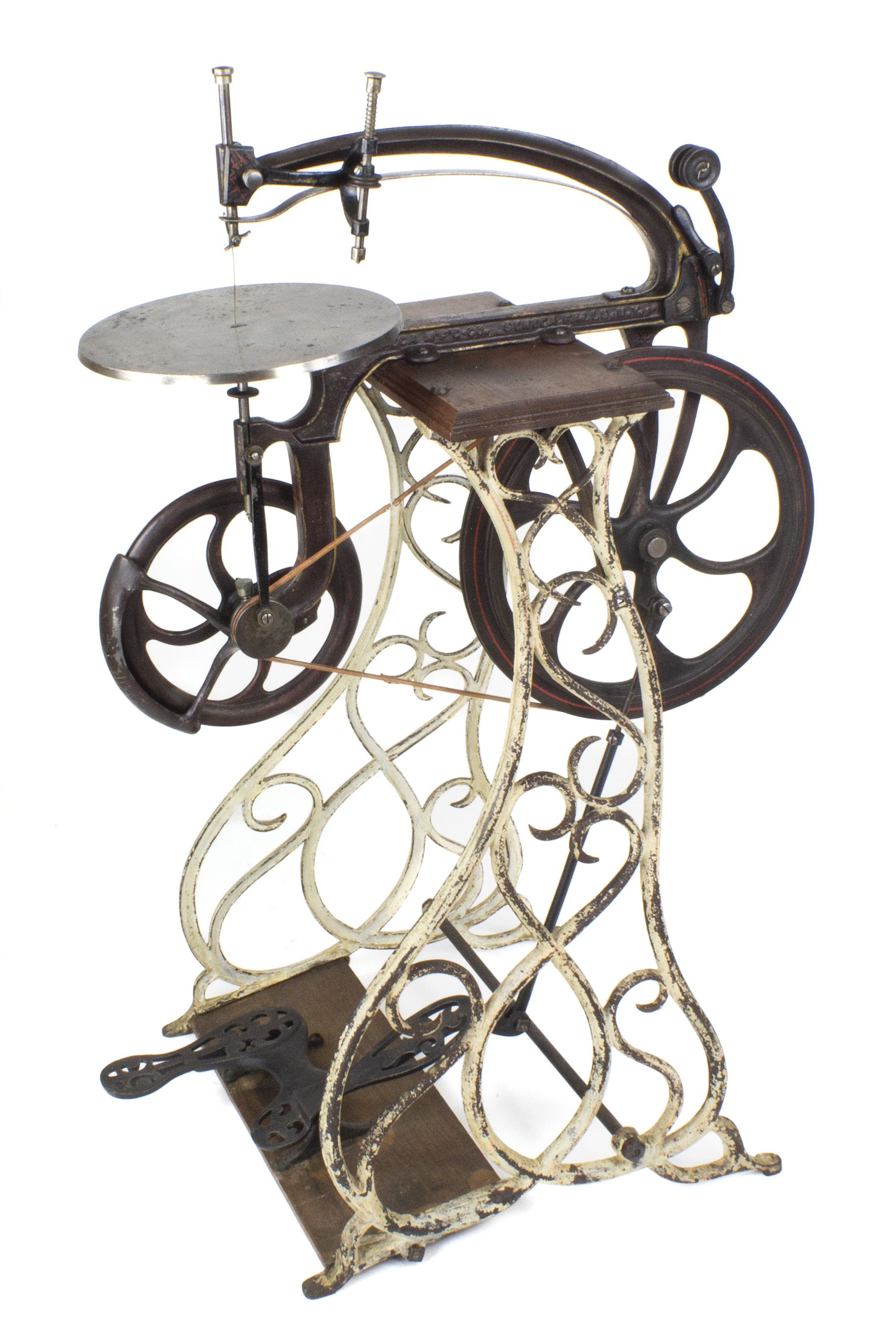 B66-226 TREADLE OPERATED SCROLL SAW. Seneca Falls Mfg. Co. The name is worn off, along with about 60% of the pinstriping, but appears to be the Challenge model, with 14" pulley. Has the optional drilling attachment, but without the separate pulley belt. Main pulley belt looks original and pretty worn. White paint on the frame about 50%. Has the Seneca Falls name and patent date for Lewis's tilting table (which Seneca acquired when it purchased Lewis Bros.) cast into the frame. Treadle mechanism works but needs some adjustment; wood and metal clean. Good 300-600