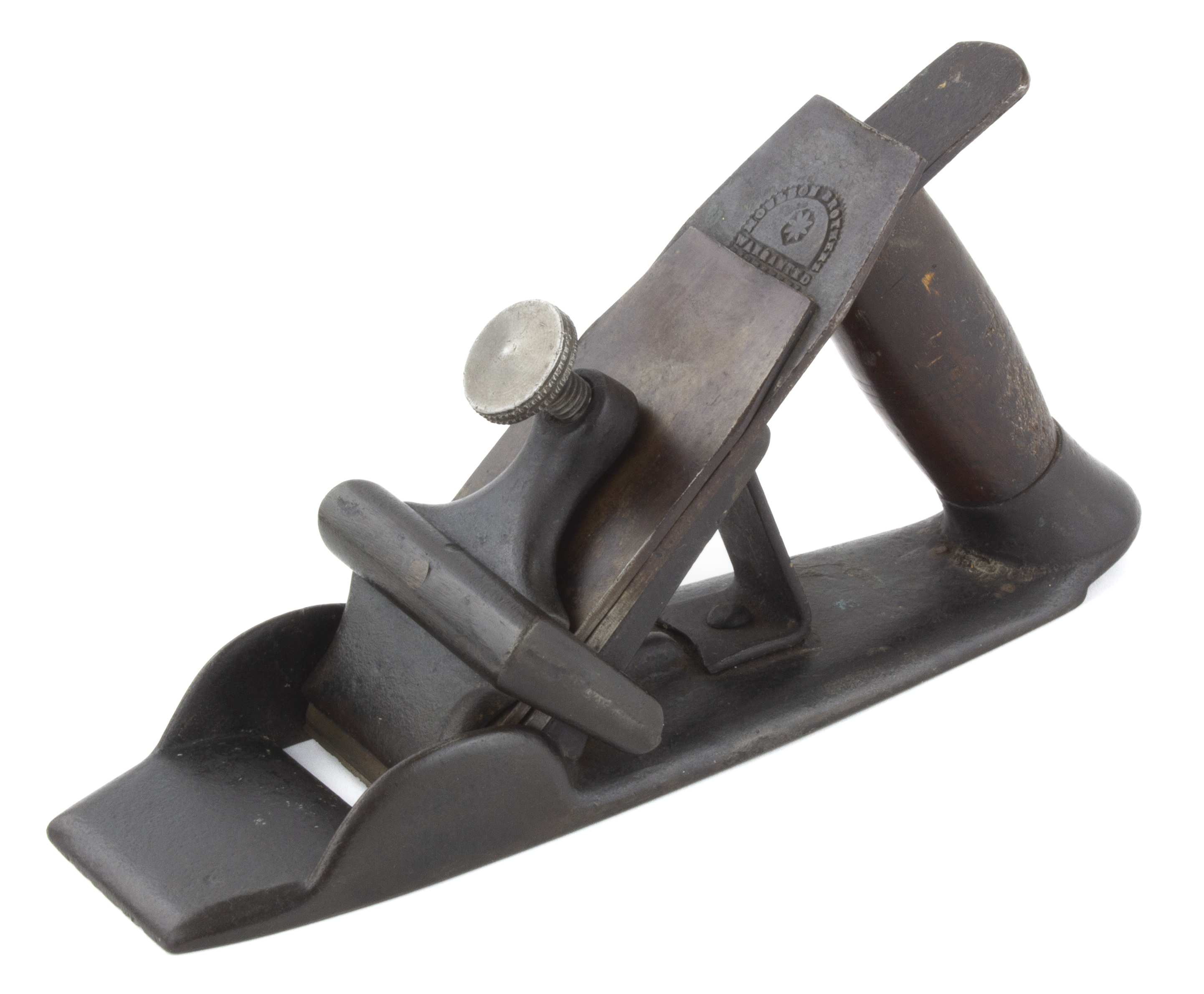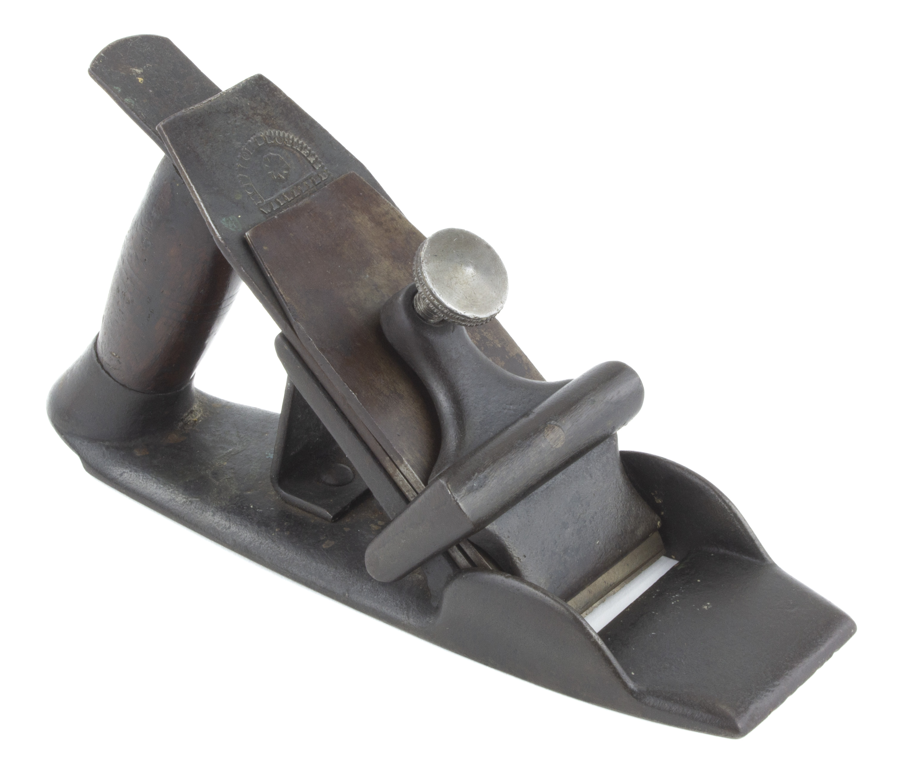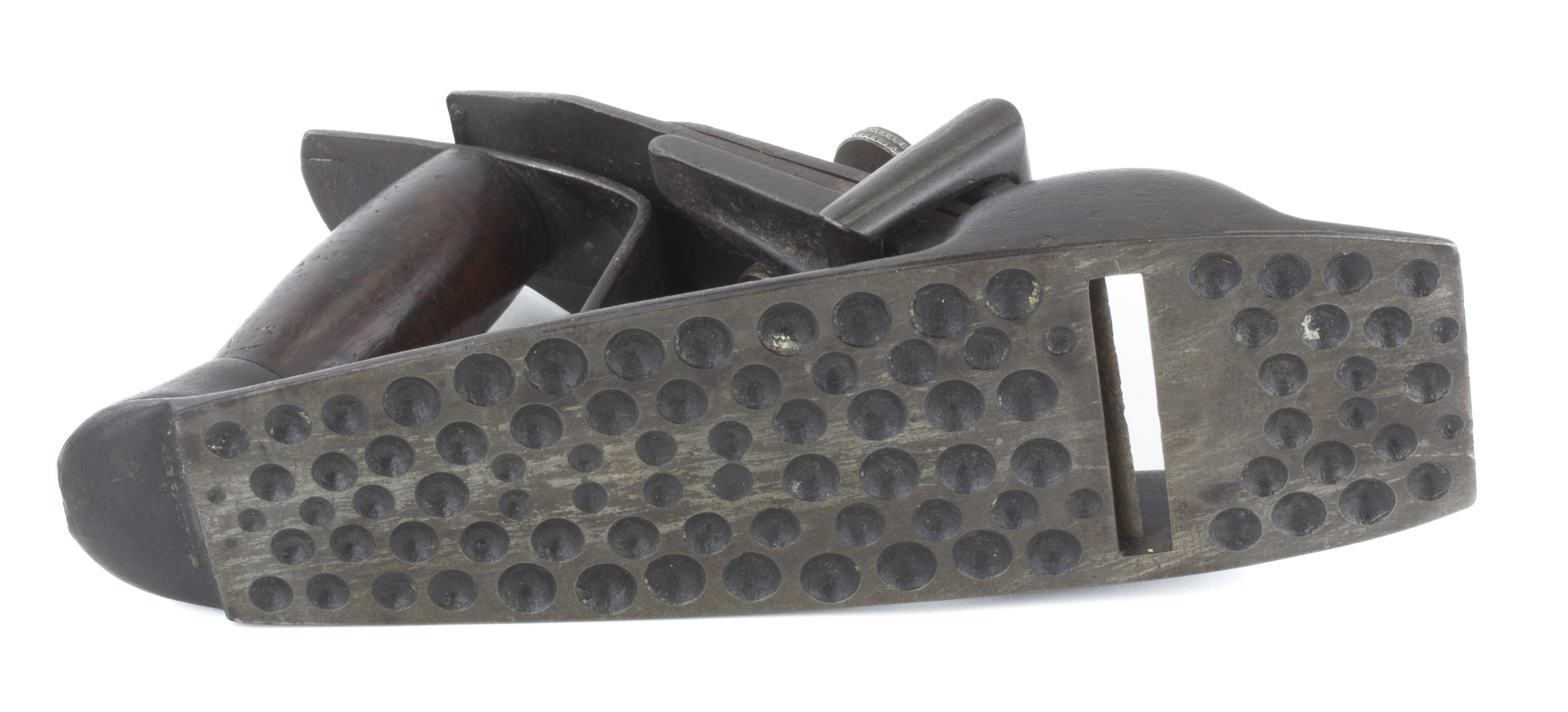 B66-343 SMOOTHING PLANE. Birdsill Holly Patent. Based on Holly's 1852 patent; the design shown in Figures 39a of PTAMPIA I with the 9" dimpled sole, but without the screwdriver slot in the cap screw. 2" original Moulson Bros. cutter, slightly spalled. Very clean overall with some wear to original maple tote. From the collection of Harold Unruh. Good+ 300-600