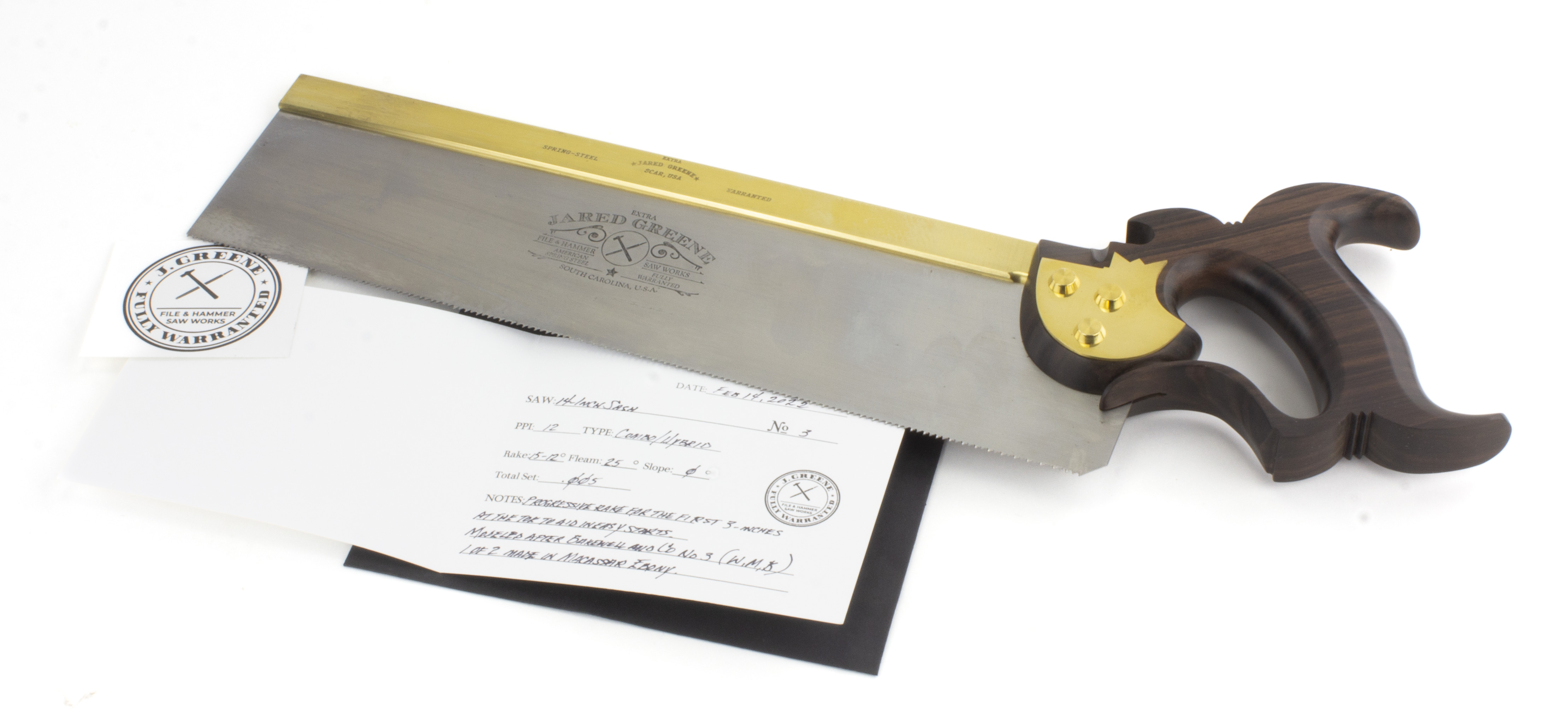 B66-424 MODERN MAKER. Jared Greene Carcass Saw. 14" blade, brass back and handle plate with domed nuts, macassar ebony handle with lamb's tongue. Made by Greene's File & Saw Hammer Works. The included paperwork describes the use of a progressive rake at the toe for easy starts, and states that it was modeled after the Bakewell & Co. No. 3 and is one of two made using macassar ebony. Like new. From the collection of David Jeffers. Fine 300-600