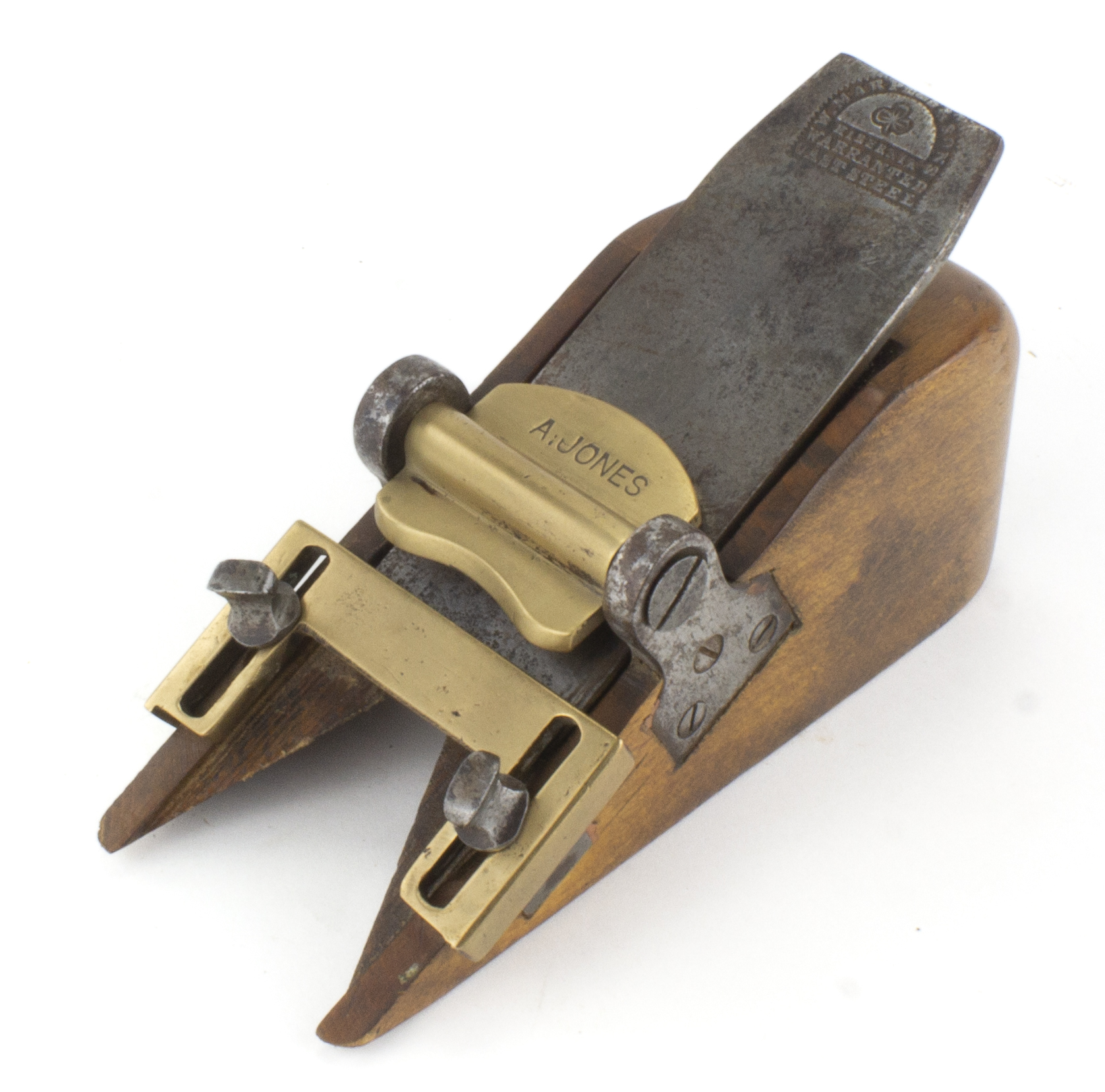B66-496 CHAMFER PLANE. Craftsman made; it has "A. Jones" stamped on the lever cap and heel. Open toe type, 6" sole with 1-3/4" W. Marples cutter held by a sliding brass bracket and brass lever cap. Well made and unusual. Fine 200-400