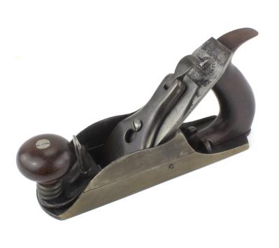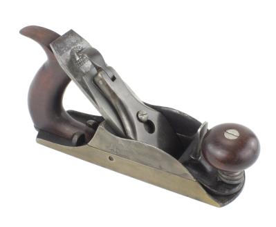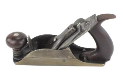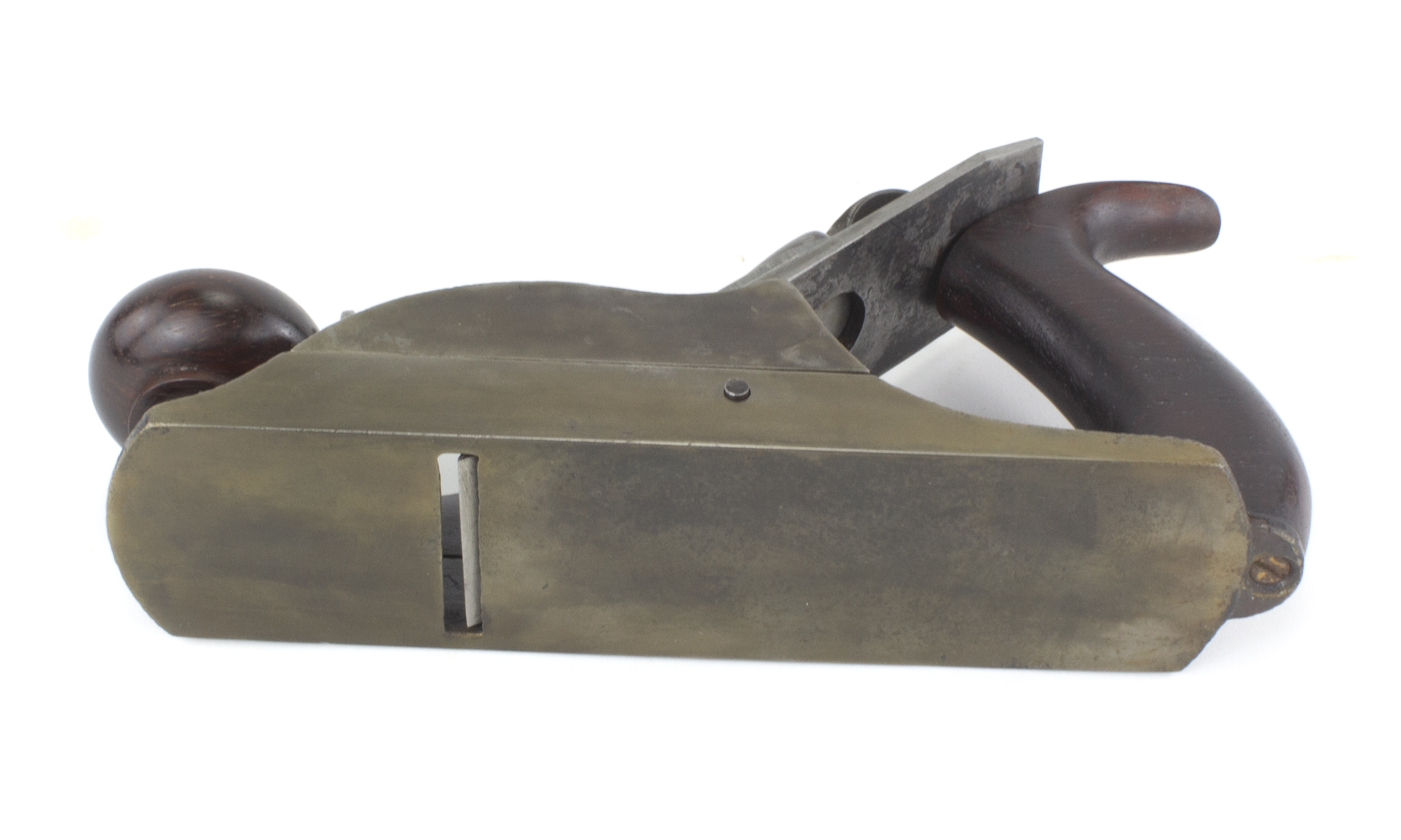 B66-659 SMOOTHING PLANE. Bailey Split Frame. An example of Series D of Leonard Bailey's initial foray into plane manufacturing, made after he relocated to Boston in 1858. It closely resembles the plane shown in Figure 13b of the biography by Paul Van Pernis and John Wells, except that instead of the knob being screwed onto a threaded rod, it is held by a flat head machine screw screwed into the boss - unusual but not unheard of. The paddle-shaped adjustment screw is cast iron rather than brass, which may be unique, and tends to rub against the knob. 8-7/16" sole and 1-1/4" original Buck Bros. iron, chip breaker may be a replacement. Wood clean, japanning nearly intact. The rod that the upper section pivots on, which was peened at the ends, is loose but present. From the collection of Harold Unruh. Good 3000-6000