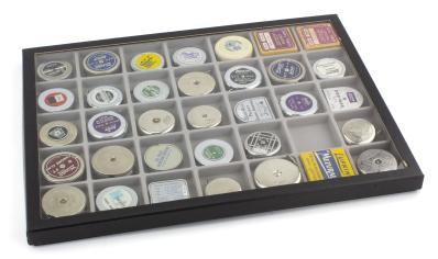 B66-784 LUFKIN TAPE MEASURE COLLECTION. Thirty-four total in a fitted tray with thirty-five compartments (one is empty) and glass lid. Most are marked by Lufkin, but there are several advertising rules made by Lufkin but marked by different advertisers, some with plastic cases. Includes three in their original boxes (worn but intact), and a No. X686 inside/outside tape marked patent pending. All at last good+ and most fine, noting a few scattered scratches and dings. From the collection of David Jeffers. Fine 600-1200