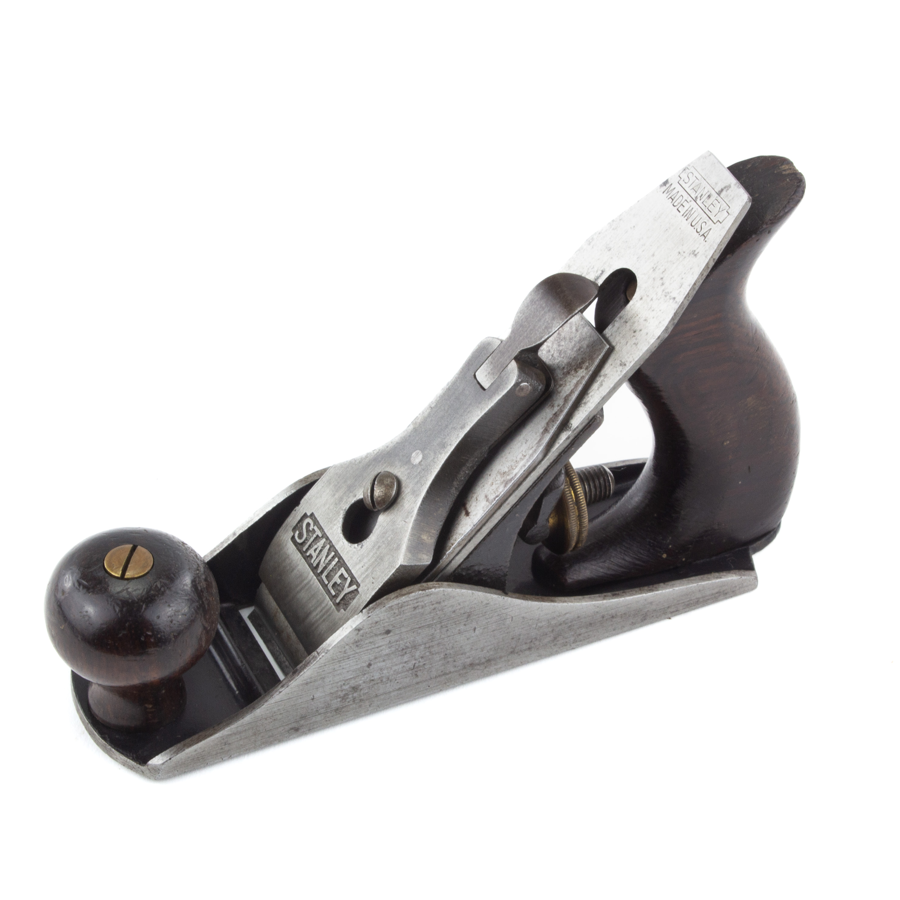 B67-3 NUMBER ONE SIZE PLANE. Stanley No. 1. Notched rectangle on lever cap and cutter, wood and metal super clean, noting a few tiny chips from tip of tote. From the collection of David Jeffers. Fine 800-1500