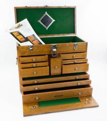 B67-10 FURRING PLANE. Stanley No. 340. Type 1 with "Patent Applied For" cutter. Japanning 95%, wood has some scratching, stains, and a couple of tiny chips from tote. Cutter has overall oxidation. A tough plane to find. Good+ 400-800