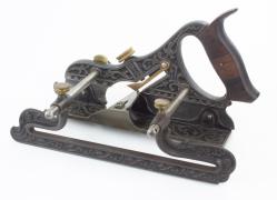B67-14 RABBET PLANE. Stanley No. 10-1/2. Later version with orange kidney lever cap and notched rectangle cutter. Tote has well reglued split and chip from end, wood and metal otherwise clean, japanning intact. Good 100-200