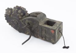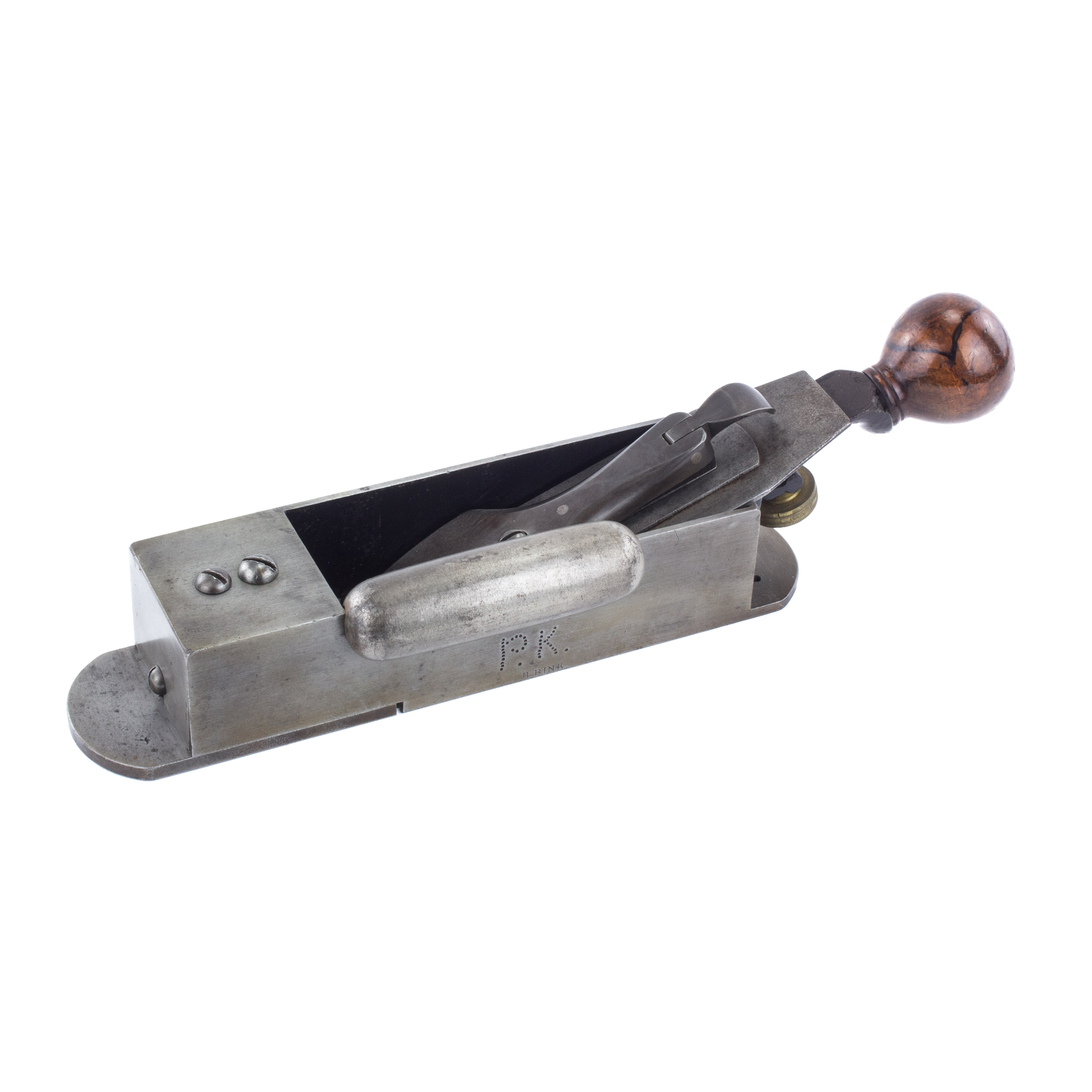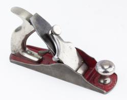 B67-16 CABINETMAKER'S BLOCK PLANE. Stanley No. 9. Original hot dog, J mark on cutter, wood and metal clean, japanning intact. There's a second screw in the body ahead of the throat that we've never seen; possibly a user modification. In addition, there are two holes tapped into the sole near the heel and user initials punched into the left cheek. From the collection of David Jeffers. Good+ 400-800