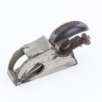 B67-24 BULLNOSE RABBET. Stanley No. 90A. Rarest of the Stanley rabbet series. Made in USA with marked cutter. Nickel plating is mostly gone from the lever cap and about 85% on the body, with some slight peeling. From the collection of Harold Unruh. Good 400-800