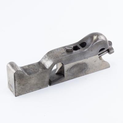 B67-36 RABBET PLANE. Stanley No. 94. Largest and rarest of the 90-series rabbet planes. Nickel is about 75% with overall wear but no peeling, mouth is unchipped and plane is free of the cracks that plagued this design. Metal disc on toe with notched rectangle mark; unmarked cutter. Good+ 150-300