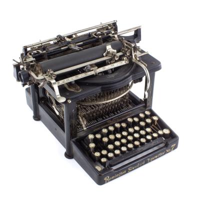 B67-43 TYPEWRITER. Remington No. 7. Blind writer type, appears to be complete but needs work; some of the keys need lubrication but appear to mostly work. Missing W key. Has a ribbon and good platen, gold pinstriping and lettering is nearly complete. 12" x 16" x 11". From the collection of Harold Unruh. Good 75-150