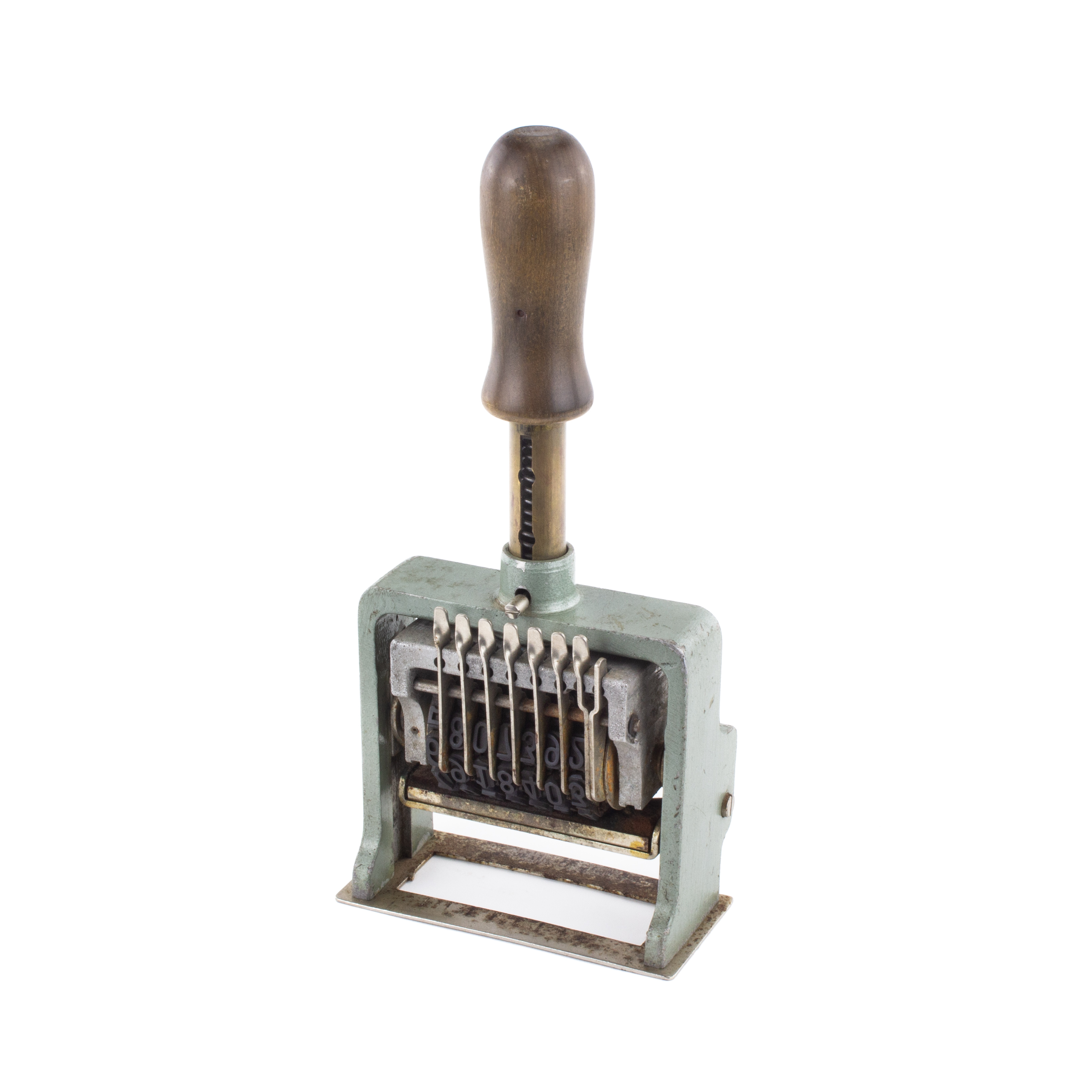 B67-44 CHECK STAMP. Only mark is "Forge", 6" x 3" x 13" aluminum body with large wooden handle. Stamps a seven digit number, ink dry but works smoothly when pushed. Light surface rust on metal parts, light blue japanning. From the collection of Jim and Christa Schoenky. Good 60-120