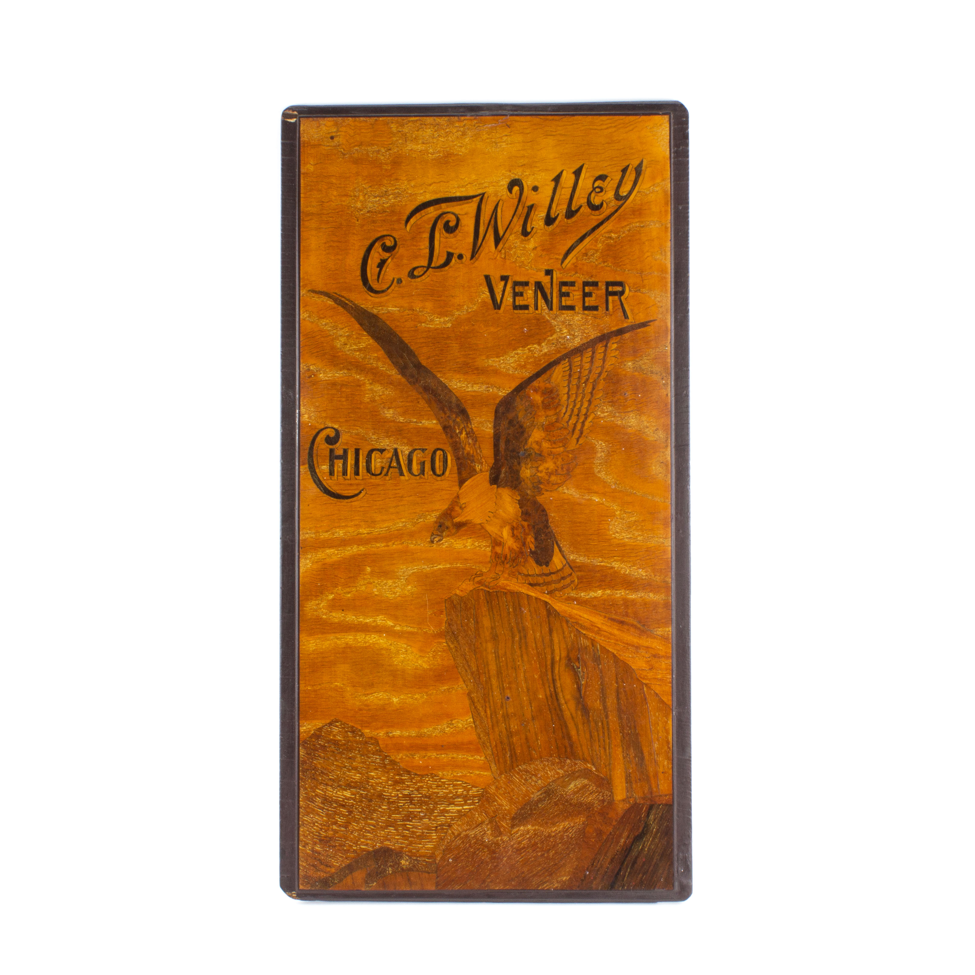 B67-48 ADVERTISING MATERIALS. C.L. Willey Vaneer Co. 21" x 11", has a picture of an eagle perched on a cliff, made of all different types of veneer, demonstrating the use of their veneers. Nicely made and very elaborate. Very minor wear, veneer is undamaged. From the collection of Steve Dice. Good+ 200-400