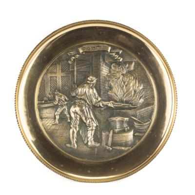 B67-50 CAST BRASS OCCUPATIONAL PLAQUE. "De Smit." 13-1/2" in diameter, hand cast brass, depicting a blacksmith at work at a forge. Heavy with clear images. Marked Williamsburg Pottery but made in Korea. From the collection of Steve Dice. Fine 100-200