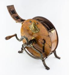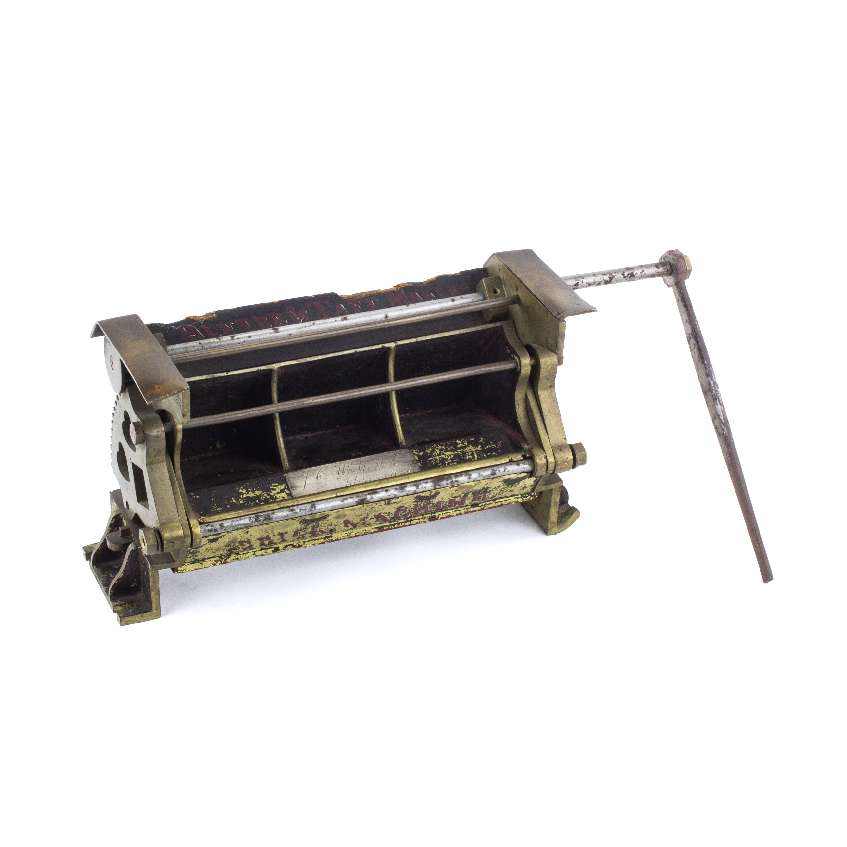 B67-52 PATENT MODEL. Brick Making Machine. Patent 75287, issued 3/10/68 to J.C. McKenzie of Adrian, MI. Mostly brass model with iron handle, 8" long plus handle, wooden back plate marked "Hunter & Taft, Makers," with wear to edge, nice name plate, some of the brass parts are bent or scratched. From the collection of Jim and Christa Schoenky. Good+ 200-400
