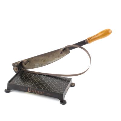 B67-54 PAPER TRIMMER. Liliput Zeiss Ikon. Likely to trim photography paper. Bed is 7-3/4" x 4" with 15" blade with wooden handle. Bed is cast iron with good paint, laid out with a grid on top. Blade has a little surface rust but works smoothly, crack in handle. From the collection of Jim and Christa Schoenky. Good 50-100