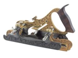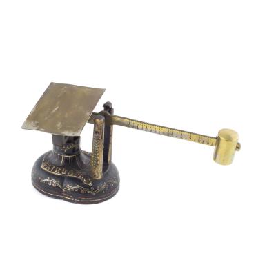 B67-55 POSTAL SCALE. Fairbanks. Cast iron base with brass weight and steel tray, 9" wide by 3" deep and 5" high. Japanned with elaborate red and gold decorative paint faded but intact, has Fairbanks cast on one side. From the collection of Jim and Christa Schoenky. Good 50-100