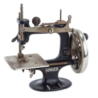 B67-56 MINIATURE SEWING MACHINE. Singer. Small size, 7" x 4" x 7", cast iron. Japanning complete with name Singer and "Trademark" on it, nickel plated parts have some light surface corrosion. Missing needle but seems to work smoothly. From the collection of Jim and Christa Schoenky. Good 100-200