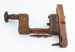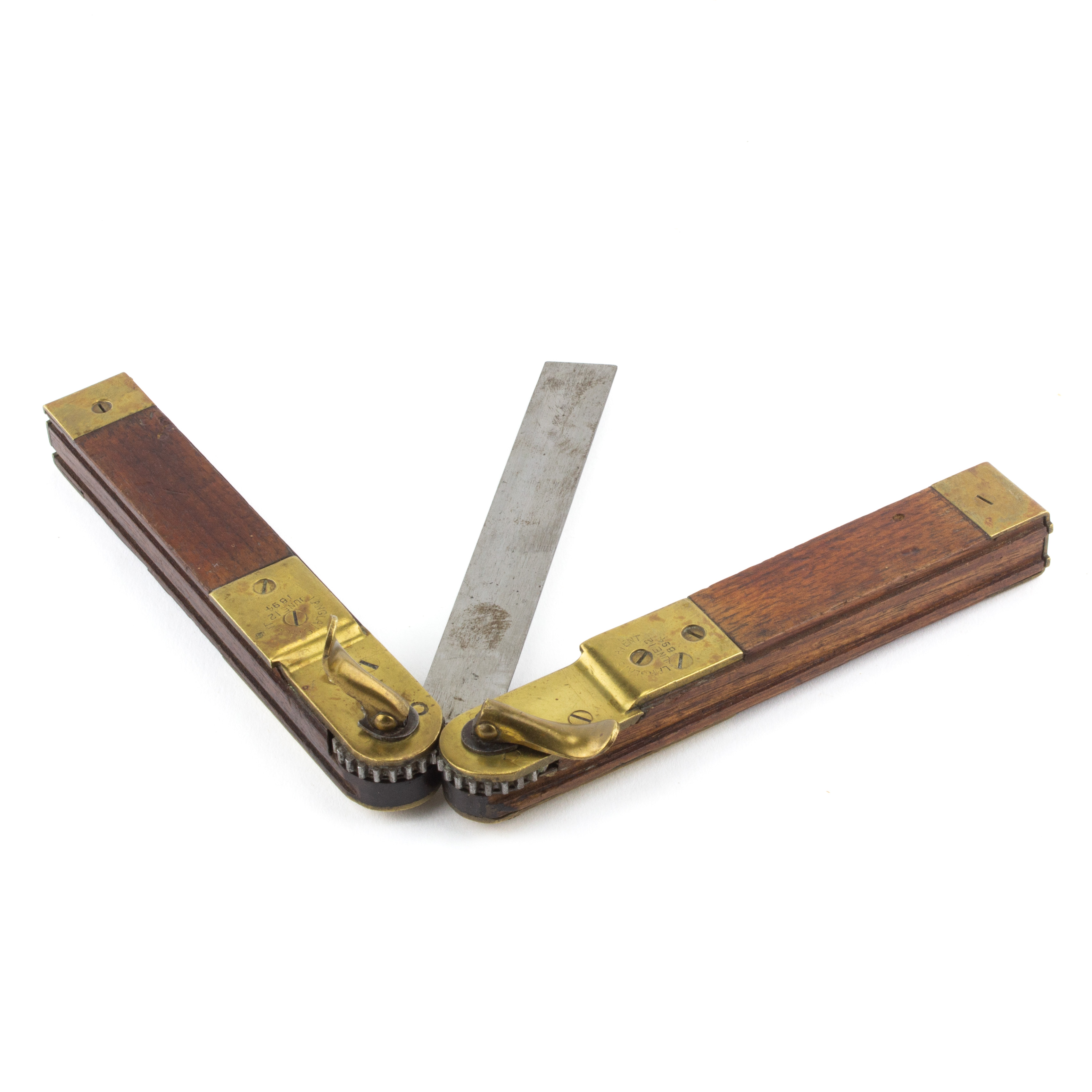 B67-58 ANGLE BISECTOR. Langlais Patent. Marked with maker name and 6/12/94 patent date, this unique bevel has rotating gears at the joint which allow the angle between the blades to be adjusted and locked with two cam levers, or the blades can be folded into body for storage or transport. Mahogany body, brass trim with patent date, some toolbox dinging and scratches, but otherwise in nice condition. From the collection of David Jeffers. Good+ 100-200