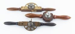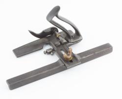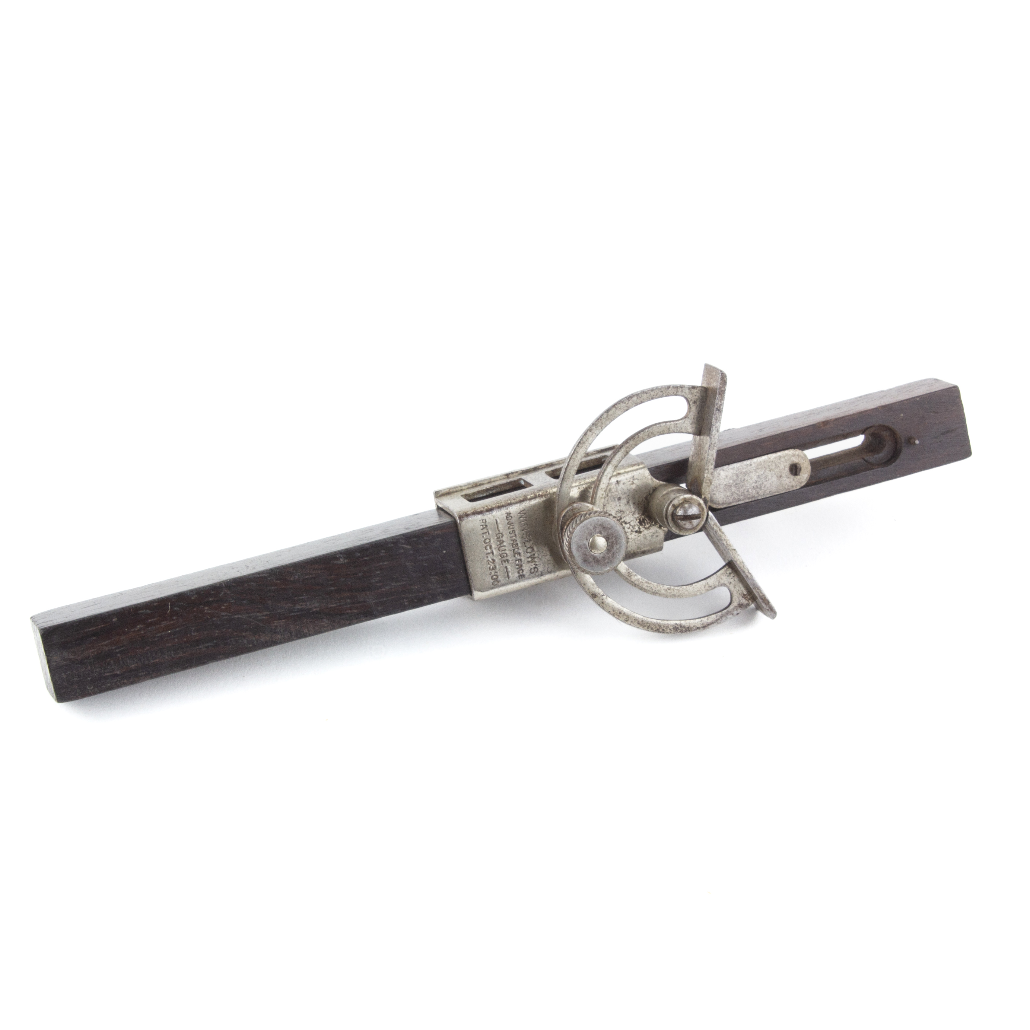 B67-65 MARKING GAUGE. Winslow Patent. Rare and gizmoish with two adjustable wings to mark curved surfaces. Complete, good pins, minor nickel loss, undamaged ebony stem. From the collection of David Jeffers. Good+ 150-300