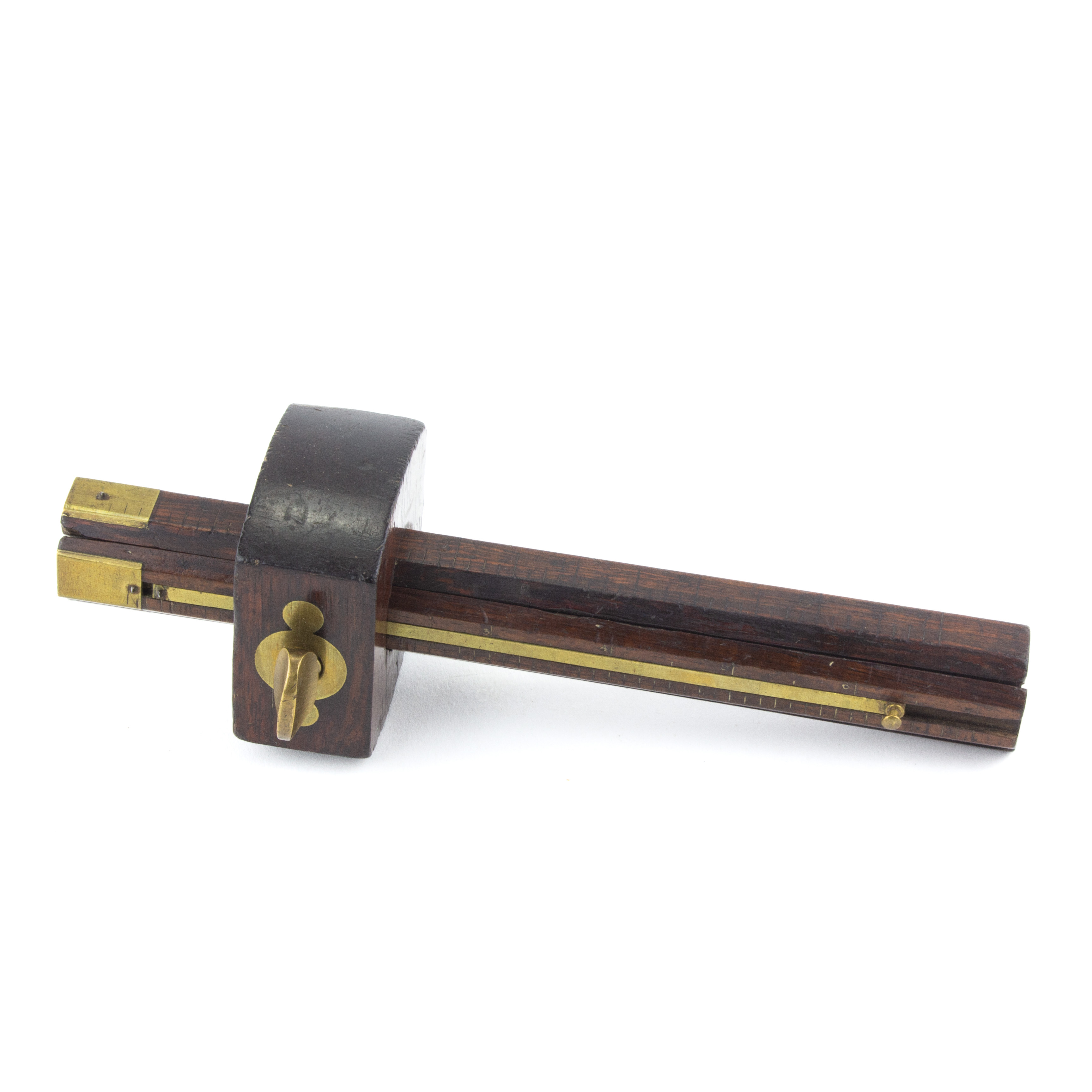 B67-69 MORTISE GAUGE. Sholl Patent. The four-bar version of Christian Sholl's 1864 patent. This was the high-end model, rosewood with brass trim and four brass discs in the head. Complete and in very clean condition with some minor scratches and dings, good clear stamp, still has all its points although worn down. From the collection of David Jeffers. Good+ 100-200
