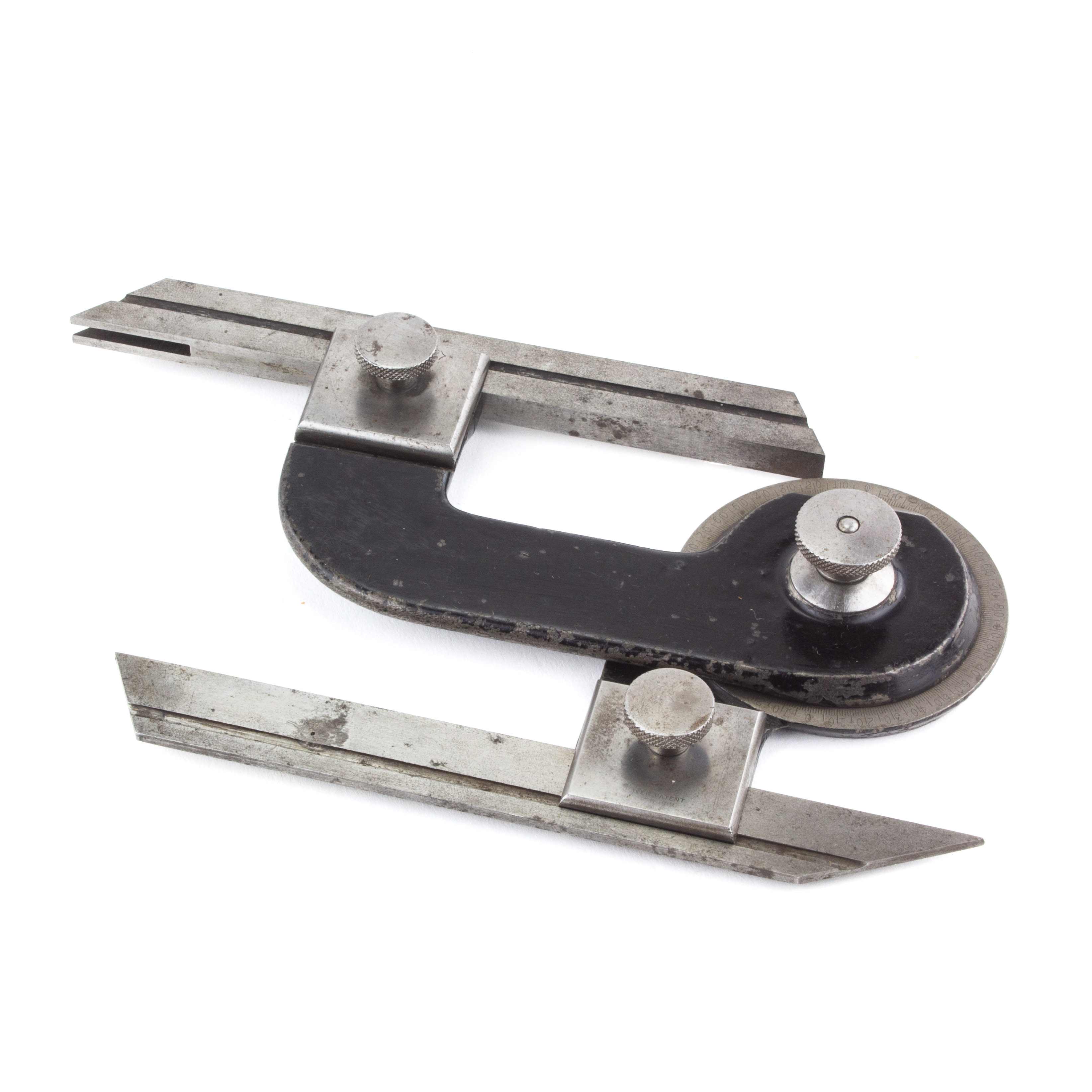 B67-76 COMBINED BEVEL & PROTRACTOR. Shaver Patent. Patented in 1918 by William Shaver of Covington, VA, and manufactured by Union Tool Co. Japanning 95%, a few spots of surface oxidation, but no rust, marked by Union Tool and with patent information. A rare layout tool. From the collection of Steve Dice. Fine 100-200