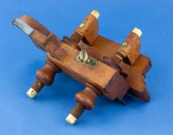 B67-77 TRY SQUARE. Bailey Tool Co. 3" iron handle with rosewood fill; 4" blade with Bailey Tool's battle-axe mark, oxidized but no rust or pitting. An uncommon square. From the collection of Steve Dice. Good+ 300-600