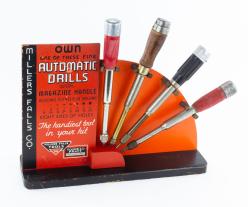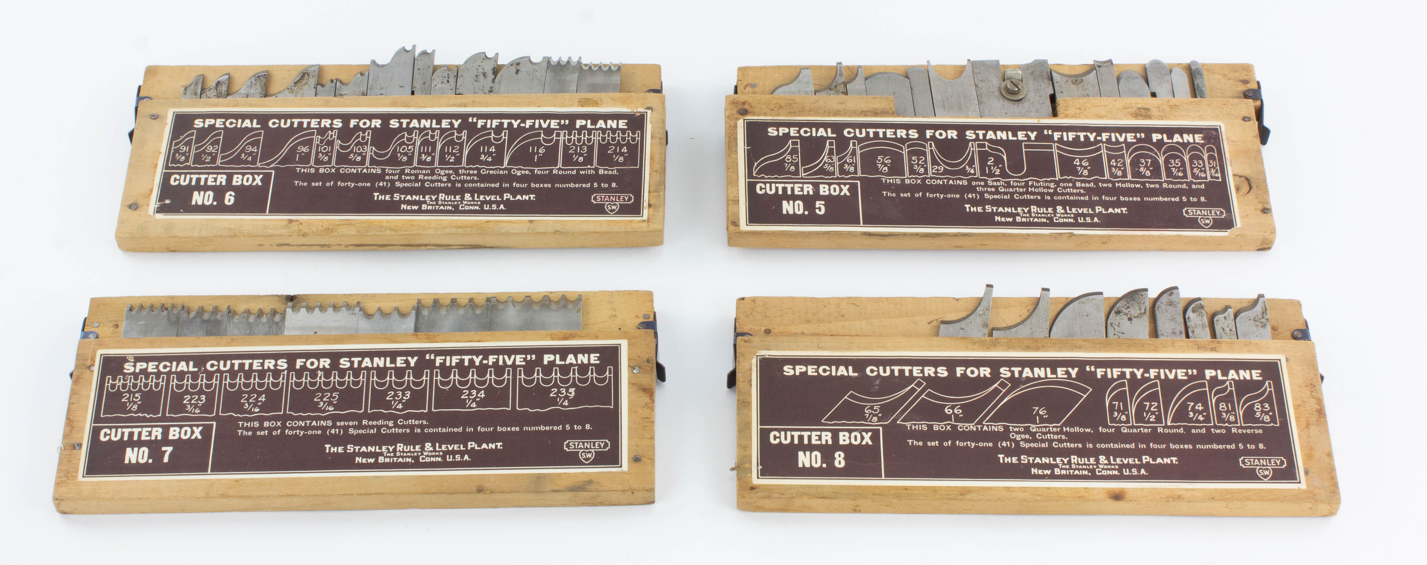 B67-92 SET OF COMBINATION PLANE SPECIAL CUTTERS. Stanley No. 55. A complete set of the 41 special cutters offered for the No. 55, in the four original boxes with sweetheart labels, numbered 5-8. Cutters are in near mint condition, boxes very clean. A near perfect set. Fine 900-1500