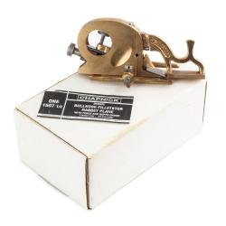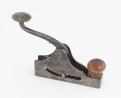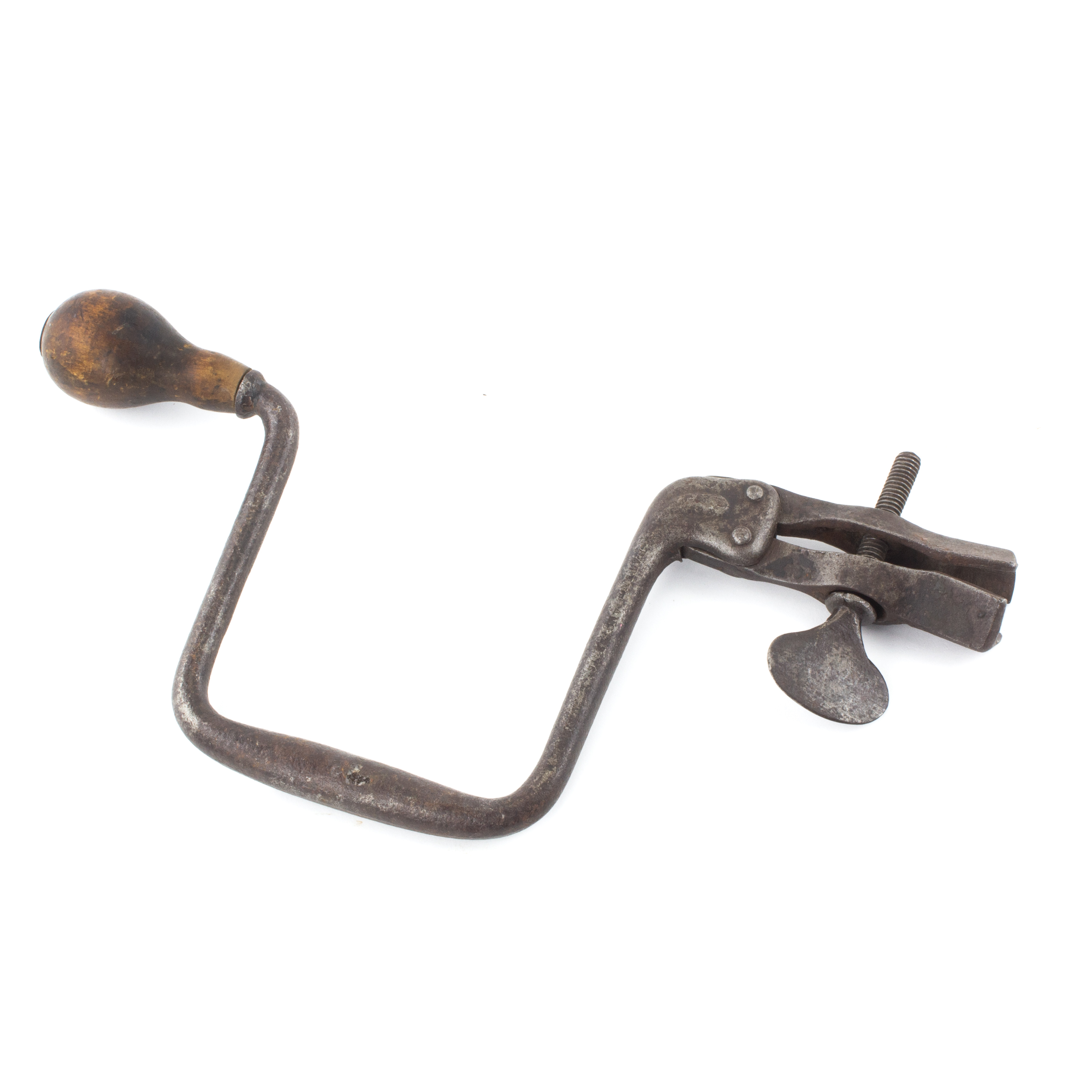 B67-97 COMBINATION WRENCH-BRACE. Green Patent. Patented August 29, 1876, #181,574, by George W. Green. Marked with patent date on frame, consists of a thumbscrew-locking wrench jaw, 10" sweep, round wooden head. Metal lightly pitted but works smoothly. Rated A in Pearson. From the collection of Jim and Christa Schoenky. Good 125-250