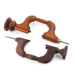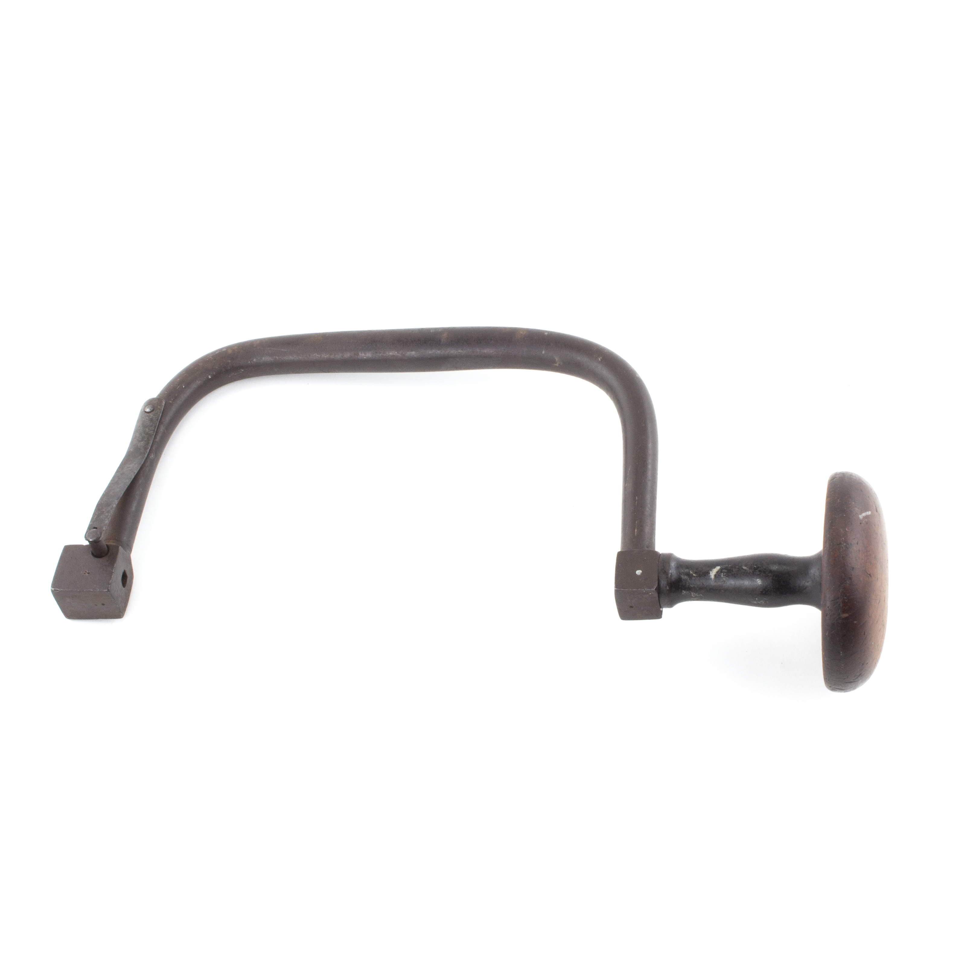B67-99 IRON BRACE. J. Winkelhouse Patent. Patented September 21, 1869, #95,060, and has an A ranking in Pearson. Unmarked but looks just like the patent drawing with spring loaded chuck. 10" sweep, metal is oxidized but no rust or pitting, wooden head with tall cast iron base. Uncommon. From the collection of Jim and Christa Schoenky. Good 150-300