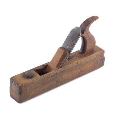 B67-110 1829 MOLDING PLANE. J. Koons. 1" center bead, 10-3/4" long with a decoratively shaped open tote, flat chamfers. Stamped "J. Koons 1829" on the toe; rated "UR" in AWP. Octagonal iron strike button ahead of throat. Sole has wear, but overall clean. From the collection of Steve Dice. Good+ 100-200