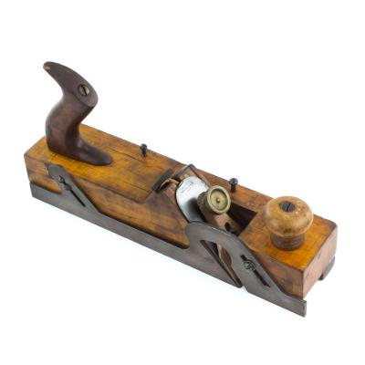 B67-114 PROTOTYPE MOVING FILLETSTER. Possible Model Shop. Wooden body, 12" long. mahogany sliding fence, full length iron depth stop. 1-5/8" Union Mfg. cutter on wooden frog with depth adjustment that seems incomplete. There are two holes bored in the side that look like they are designed to receive fence arms and are locked by wood screws. The whole thing has a handmade prototype or model look to it, and it has "1532" painted on the toe that looks like a model shop number. Overall clean and intriguing. From the collection of Harold Unruh. Good+ 150-300
