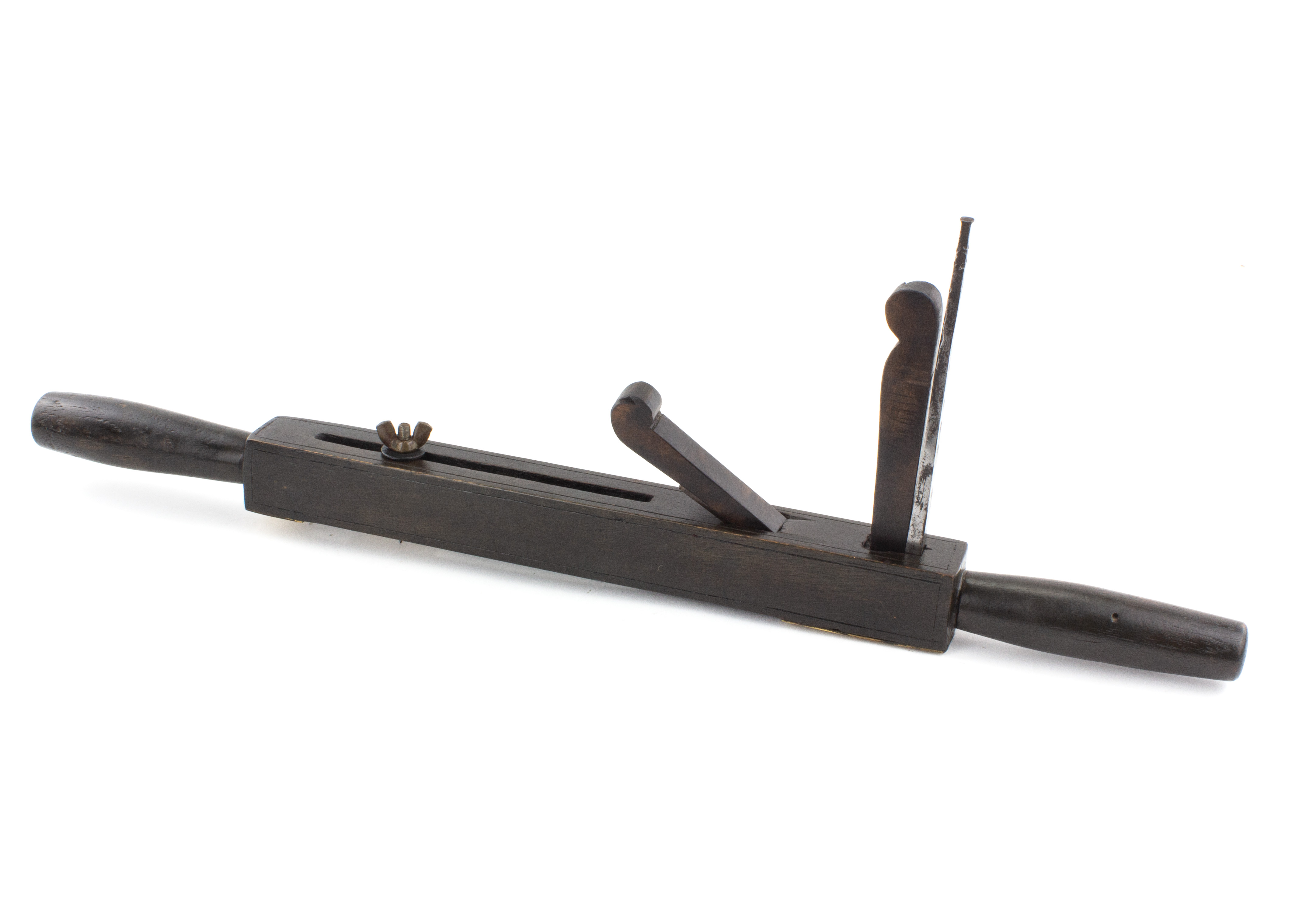 B67-119 COOPER'S HEAD CUTTER. Designed to simultaneously cut and chamfer the head for barrels in dry cooperage. See Whelan, page 329. Unsigned and probably made by a cooper for his own use, 26" long with a sliding point to cut heads of different diameters. Made of a dense dark wood, with brass plates. Well made and unusual. From the John Lervoog collection of cooper's tools. Good+ 100-200