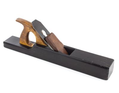 B67-120 EBONY FORE PLANE. 16-1/2" razee body, solid ebony, a couple of small chips at the toe and some scratches on the sole; wedge is lighter and could be tulipwood; closed tote is beech. The plane itself is unsigned, but the 1-3/4" cutter is stamped by Goldenberg and has an original Goldenberg decal on the reverse side. From the collection of Steve Dice. Good+ 100-200