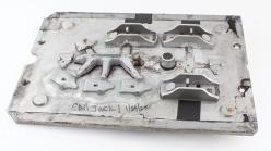 B67-122 DUTCH FENCED RABBET. Solid rosewood, 24" long with brass plates on toe and heel, the toe also has a cast brass finial that turns but appears to be purely decorative. 1" skewed cutter, fixed integral fence. Decoratively shaped tote and wedge that are a lighter, stained wood. The rosewood is immaculate. From the collection of Steve Dice. Fine 200-400