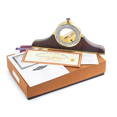 B67-123 MODERN MAKER. Bridge City CT-3 Inclinometer IOB. Part of the commemorative tool series, brass and satin steel dial, rosewood and brass body, 8" long. Mint in box, No. 558 in the series, includes certificate of authenticity and original paperwork. From the collection of Eric Cubic. Fine 125-250