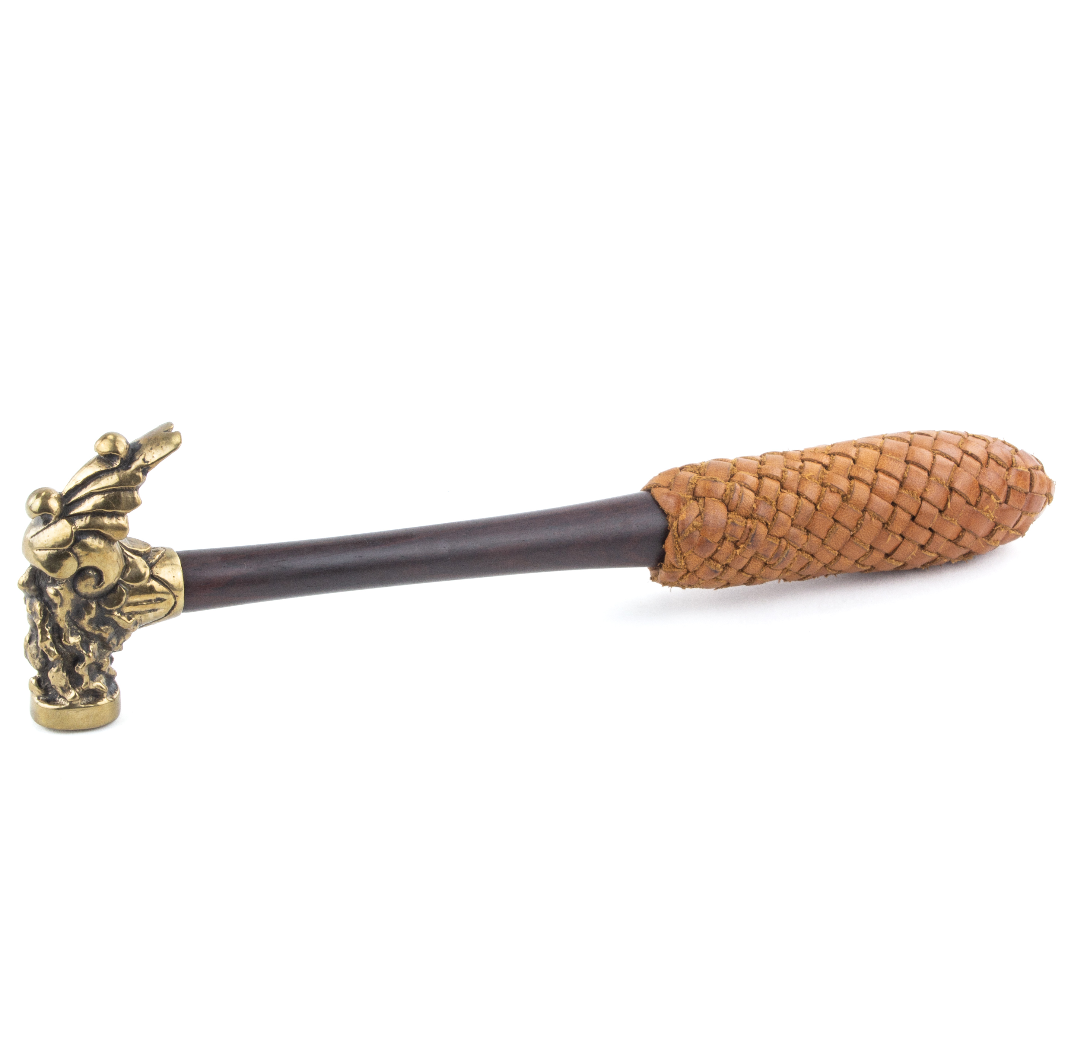 B67-131 DECORATIVE HAMMER. Heinz "Bearded Man." Brass 2-3/4" long head in the shape of a bearded man's head, ebony handle with unusual woven leather grip. Marked Heinz, 2008, under the claw. Super clean. Fine 125-250