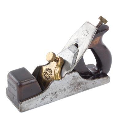 B67-137 INFILL SMOOTHING PLANE. Norris No. A13. 8-3/4" cast steel body, 2-1/4" original marked iron, brass lever cap with No. A13 cast into it, stained hardwood fill. Light pitting on body, wood has some scratches and tote reglued. From a legendary collection of infill planes. Good 400-600