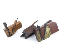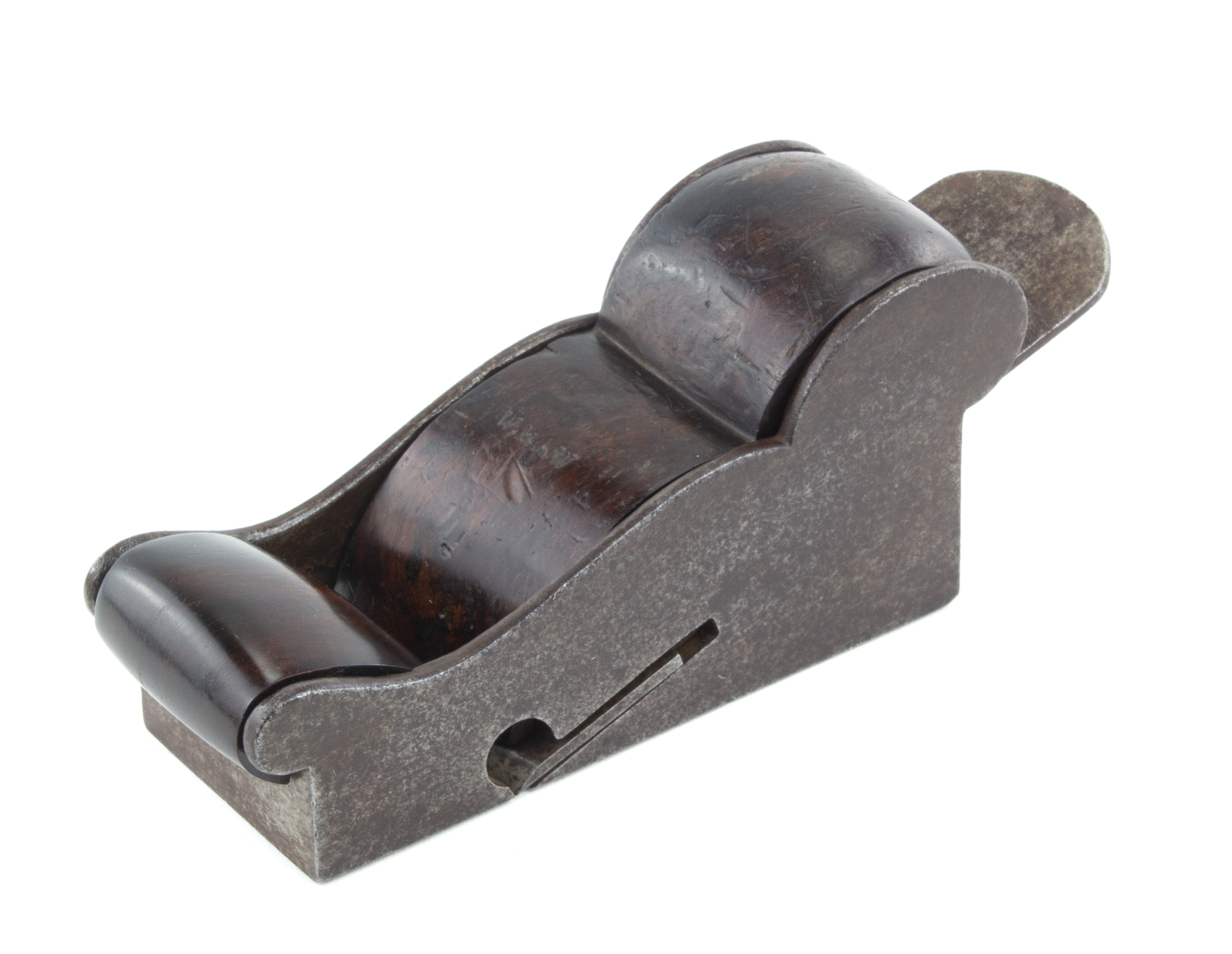 B67-138 INFILL SKEW RABBET BLOCK PLANE. Unmarked, 4-3/4" cast iron body rosewood wedge and bun, 1-1/2" unmarked iron. Cheeks have unusual rabbet escapements. Wood has light scratching and dinging but no major damage, metal has overall oxidation and light pitting. From the collection of Harold Unruh. Good+ 125-250