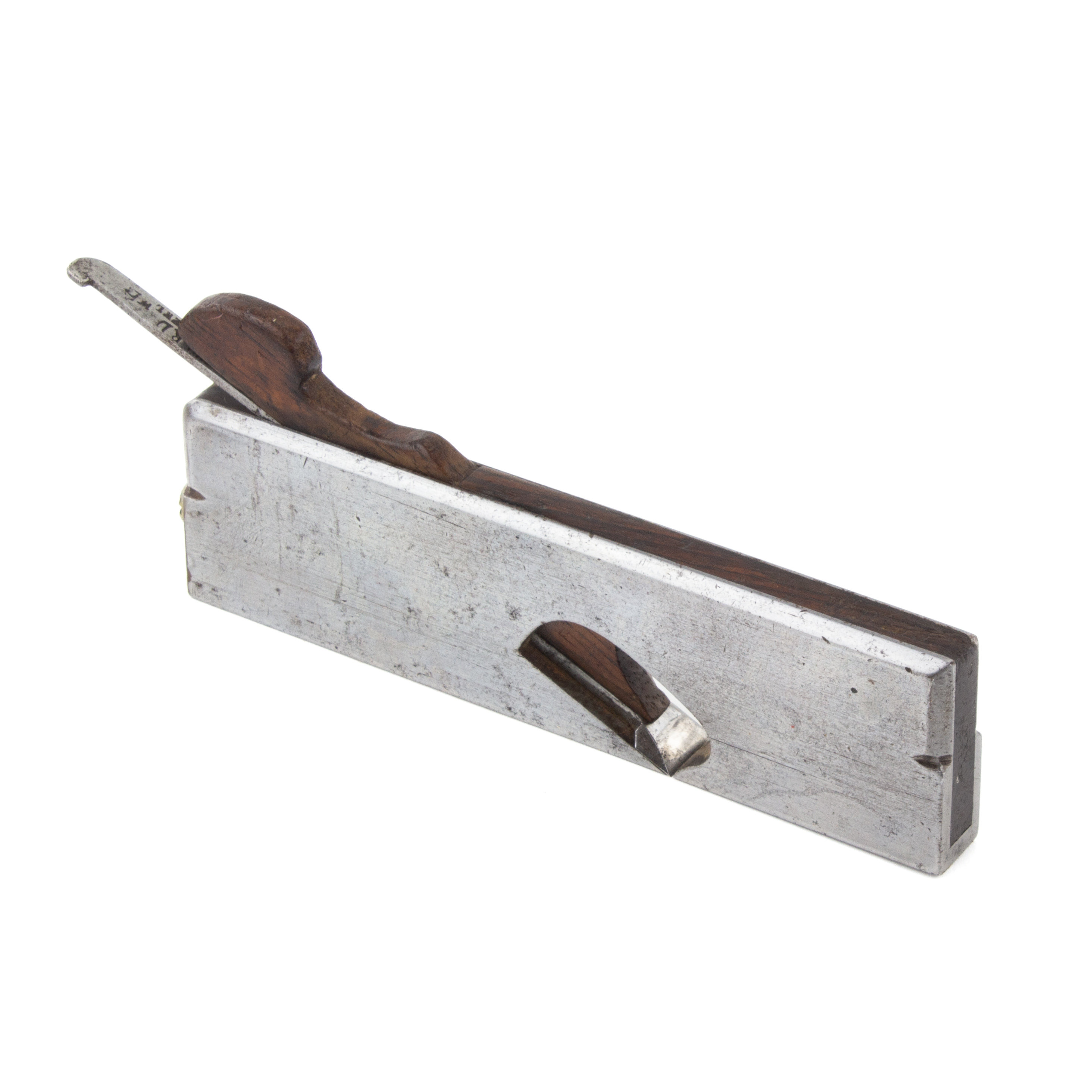 B67-144 INFILL REBATE PLANE. Stewart Spiers. 6" cast steel body, 1/2" Ward iron, rosewood fill and wedge. Matching assembly number on iron and wedge. Wood and metal both very clean. From a legendary collection of infill planes. Good+ 150-300