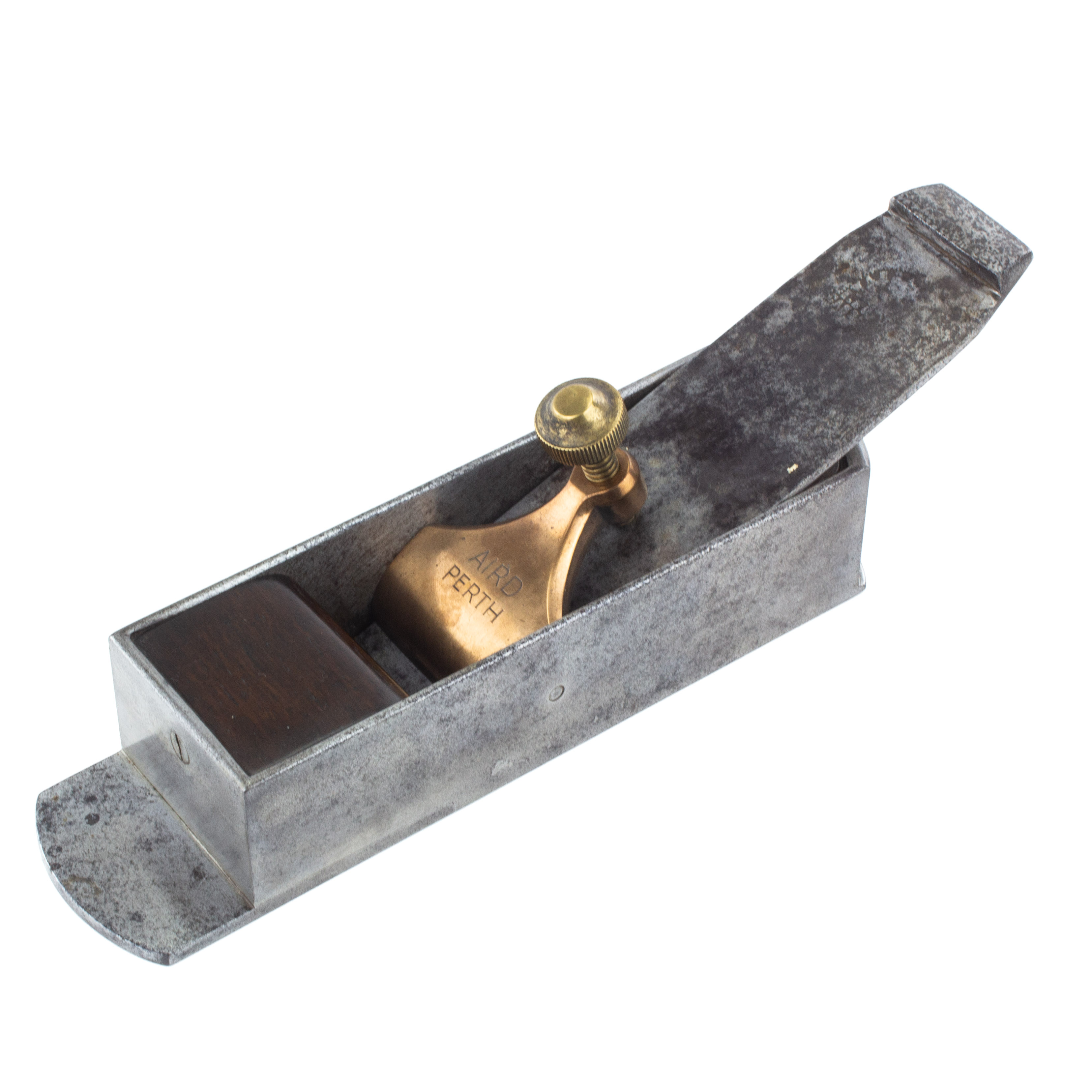 B67-146 INFILL MITRE PLANE. Aird Perth. 9-3/4" cast steel body, rosewood fill, 2-1/8" snecked Ward & Payne iron. Stamped Aird Perth, which looks like a maker, on the brass lever cap. Wood and metal both very clean. Good+ 500-750